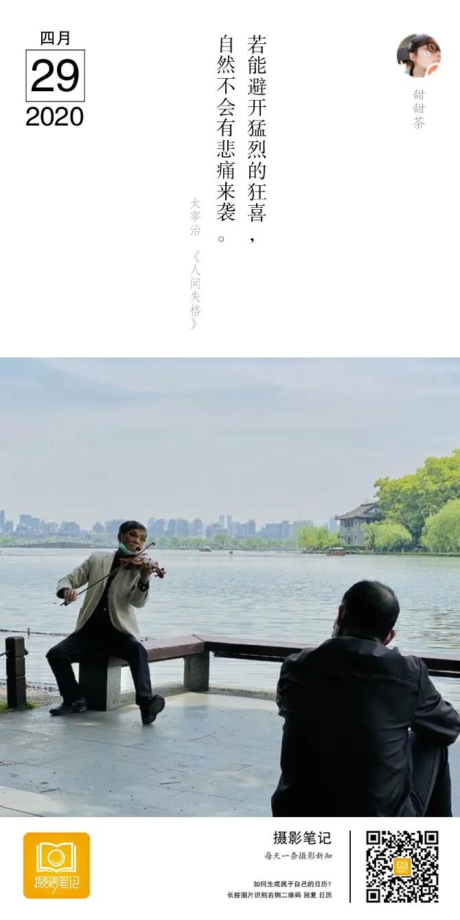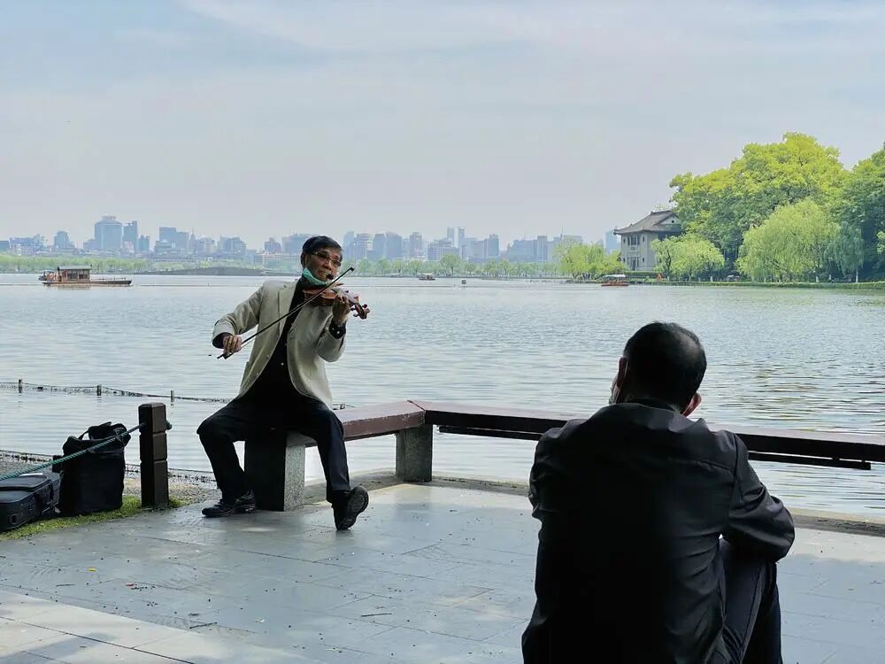 午后西湖边微风习习,一位老者倾听小提琴悦耳的旋律入神,而演奏者也全情投入,当时正奏我爱你中国,油然而生自豪之情,美景加美乐,老有所乐,这就是我们的美好生活!