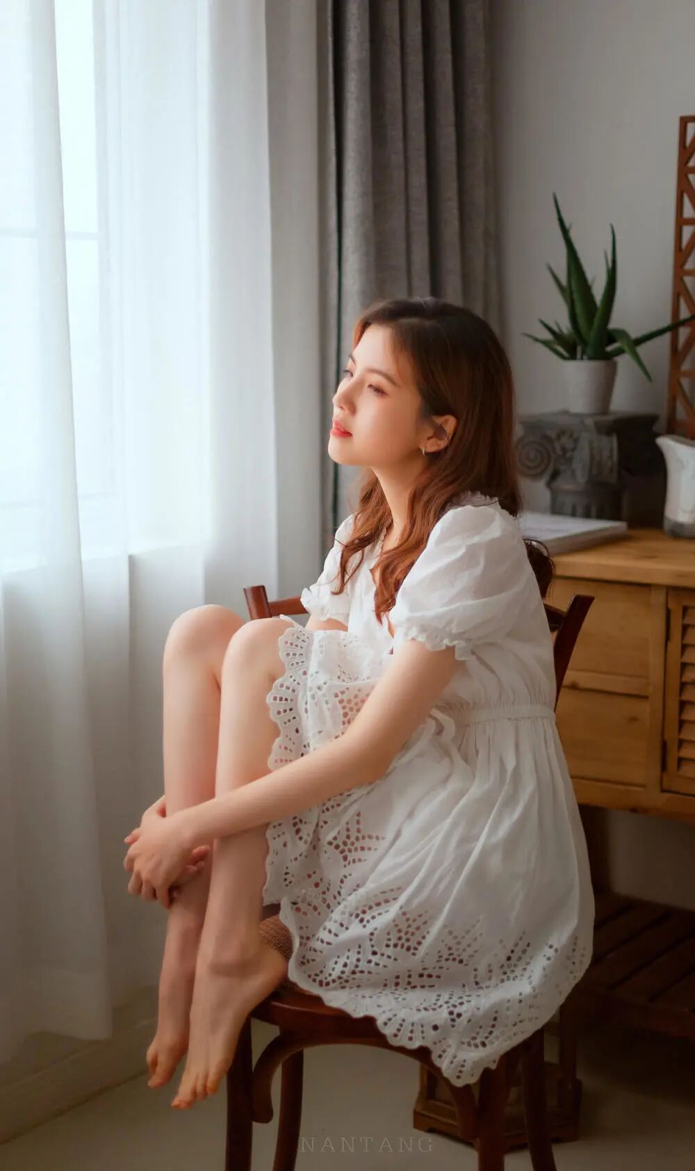 午后的光线透过窗纱柔和的洒落在房间,女孩慵懒的坐在椅子上看着窗外的风景,宁静、安详、温馨。窗外光线强防止过曝减曝光拍摄,突出人物局中构图,后期提亮暗部,调色,表现柔和温暖。