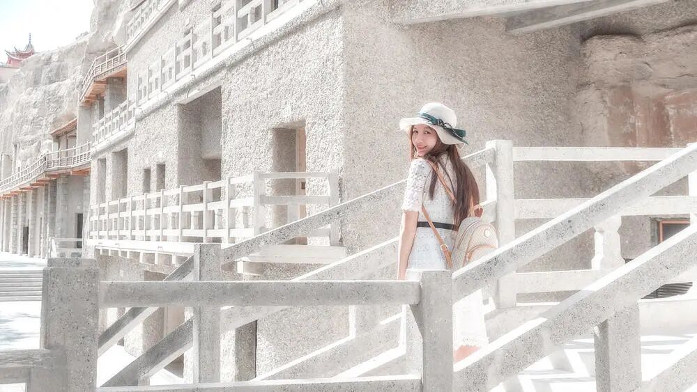 给老婆拍的旅行记录,西北地区艳阳高照,老婆穿的也是白色衣服,所以影调就想着往高调方向走,想表达一种纯洁纯真浪漫的感觉。发现有一条天桥连接到窟洞长廊,让老婆站上去,来个回眸一笑,人物三分构图。窟洞群呈放射状向远处延伸,主要想表现窟群众多。想着是旅行记录,人物景物也要清晰反映出来,所以用了小光圈拍摄,同时也能避免中午拍照过爆的问题。后期加了古典柔焦效果,配合高调影调,使照片更加梦幻。