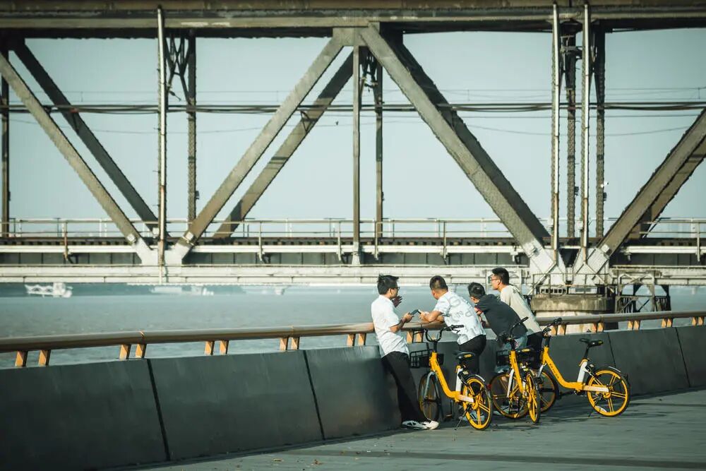 好久不传照片了,来传一张,江边路上四个小伙子来看江景,远处是跨江的大桥,可以过火车,这个时候有火车来会更好,但是比较难