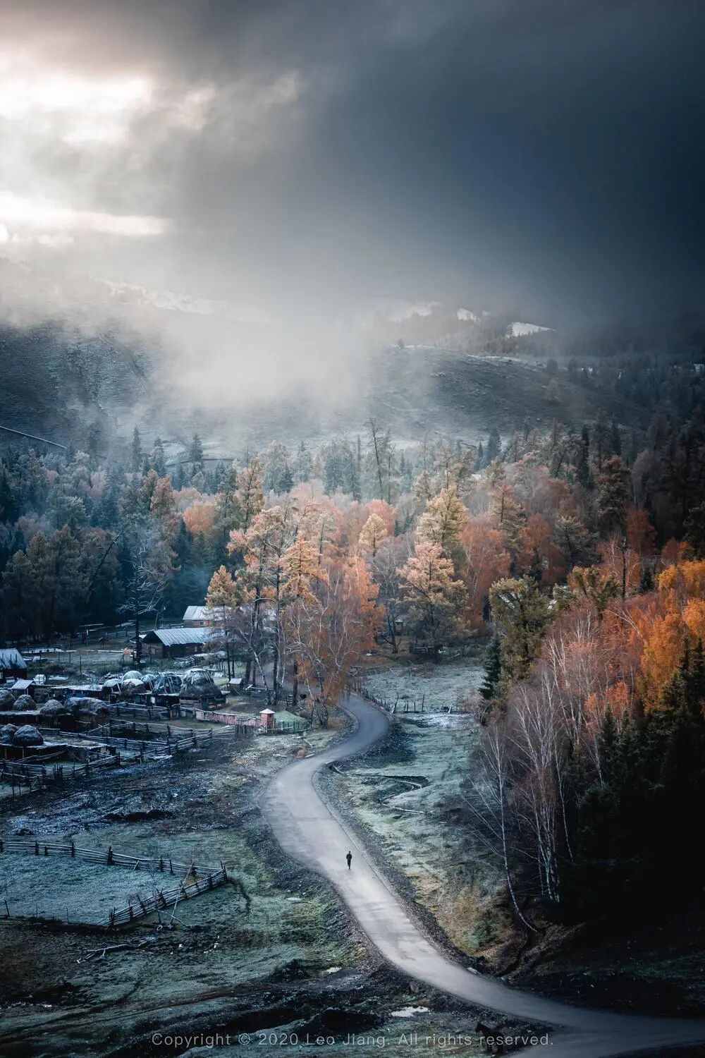 白哈巴村刚下过雪的清晨,阳光还没有完全照过来,秋天的黄叶依旧喜人,云雾缭绕的村庄慢慢的苏醒过来。