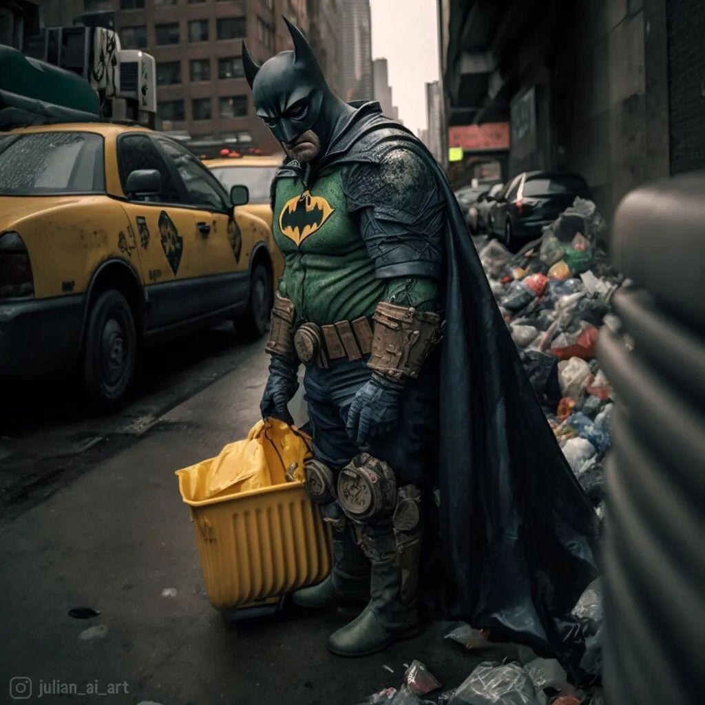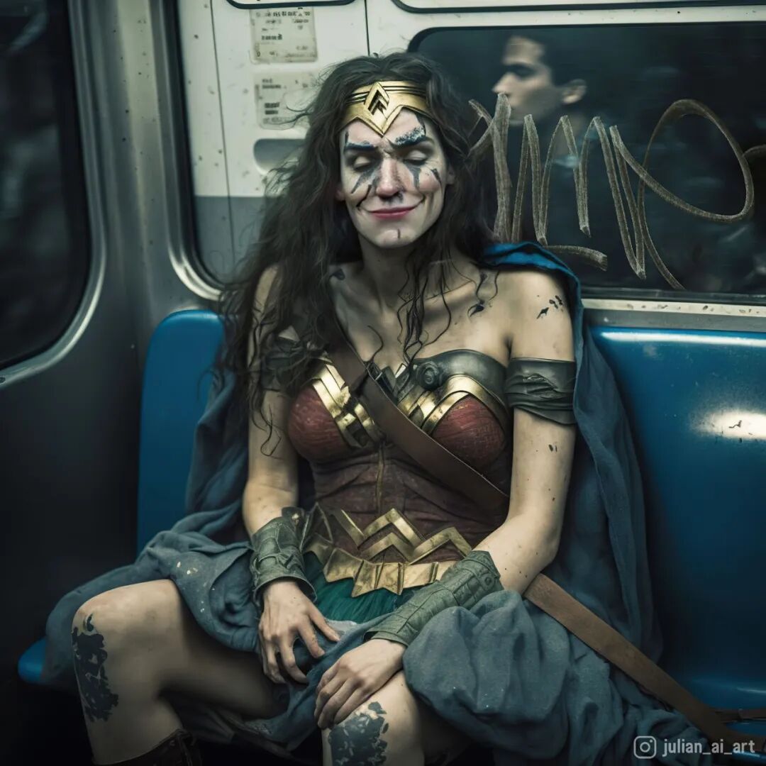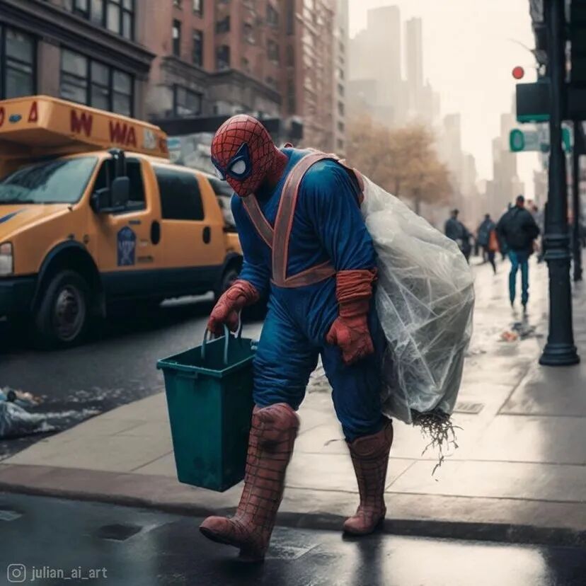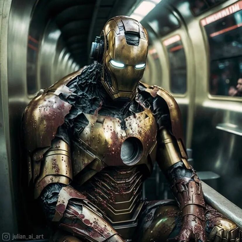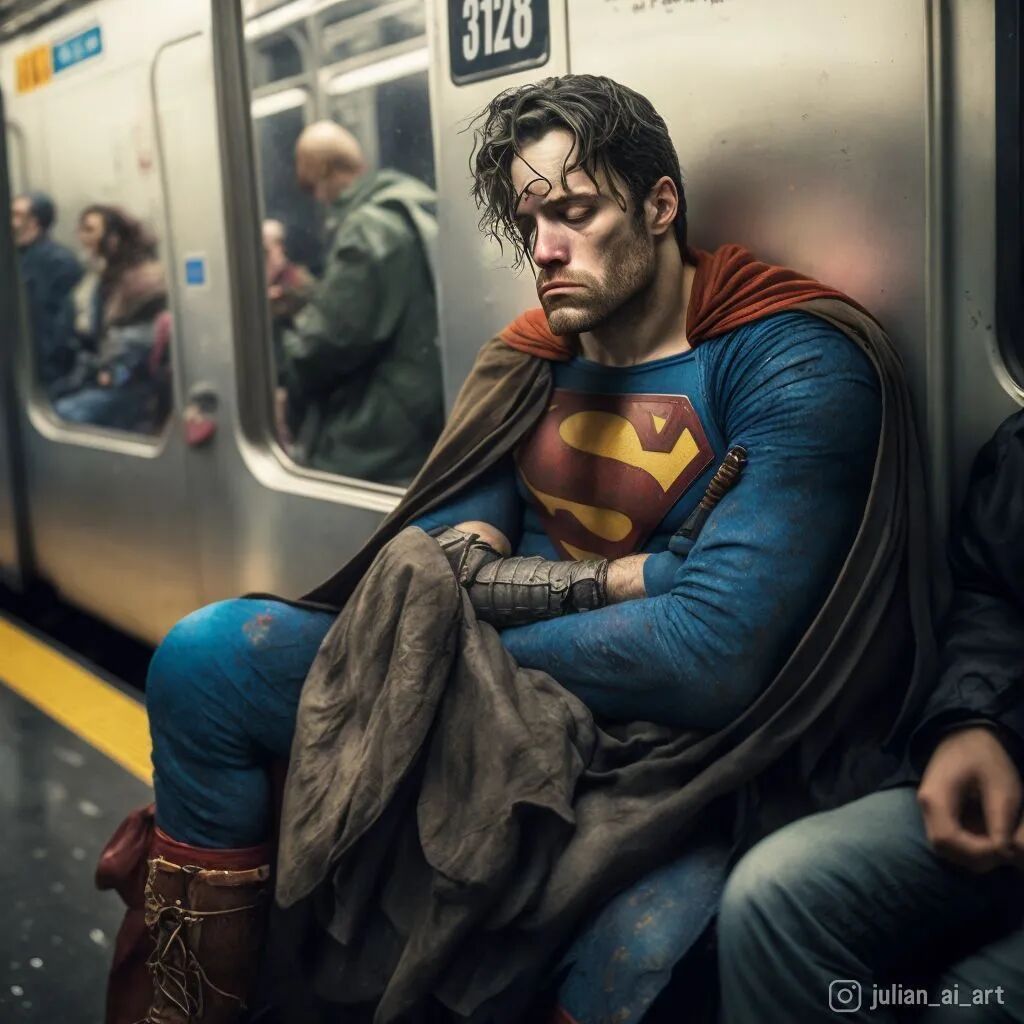 朱利安·范·迪肯也感叹人工智能绘画强大的力量,于是,他利用人工智能生成了一组十分有趣的图像,这些图像的原型来自影视作品中的超级英雄,通过文字描述,朱利安·范·迪肯将这些超级英雄从拯救人类的位置拉了下来,将他们变成了一个个普通人,似乎说明了在人工智能面前,即使是超级英雄也十分无力。