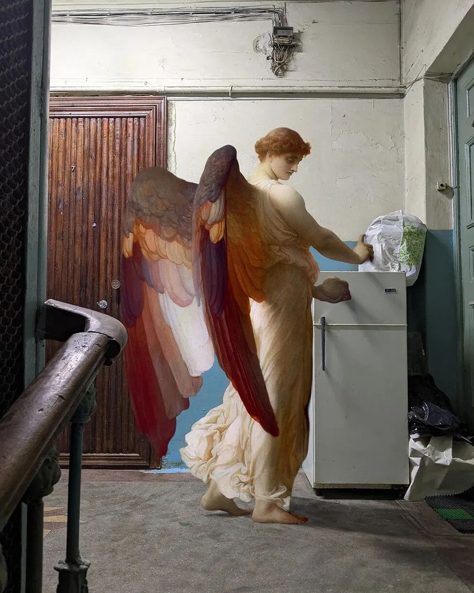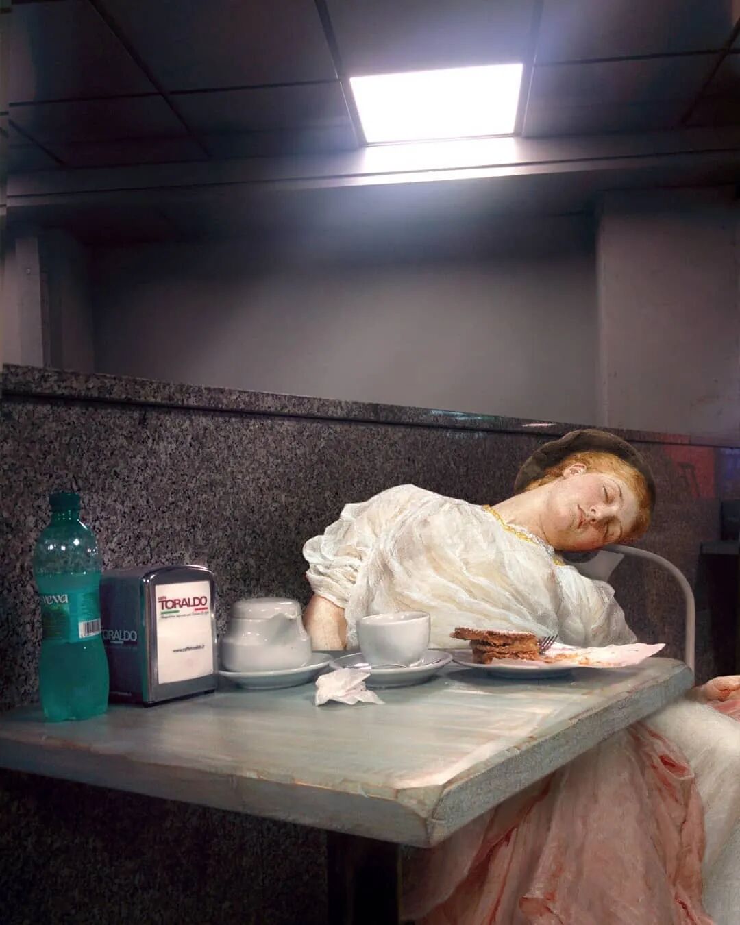 来自乌克兰的多媒体艺术家阿列克谢·康达科夫,就凭借一系列“穿越”作品而得名。作品中描绘的是,古典绘画中的人物,融入了当下的现代生活场景中,非常有意思。在几年前,小绛就曾经跟大家分享过他的作品,没想到几年过去了,这个名为“当代生活中的艺术史”的系列作品,这位艺术家一直没有停止更新创作,这也说明了,这些富有想象力的“混搭”,深受人们的喜爱。