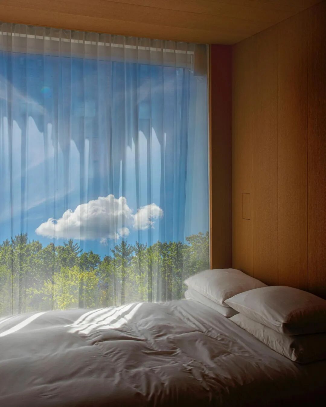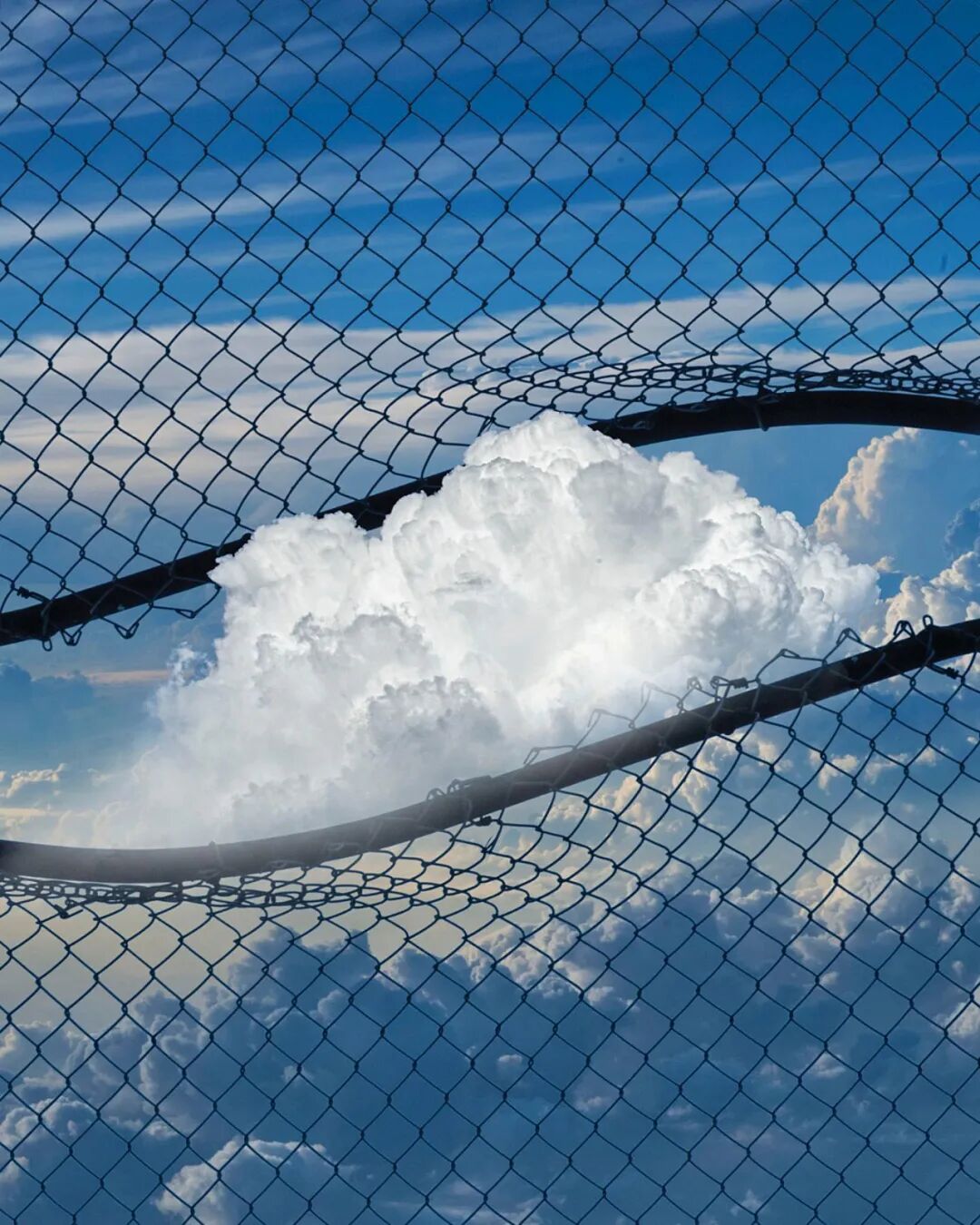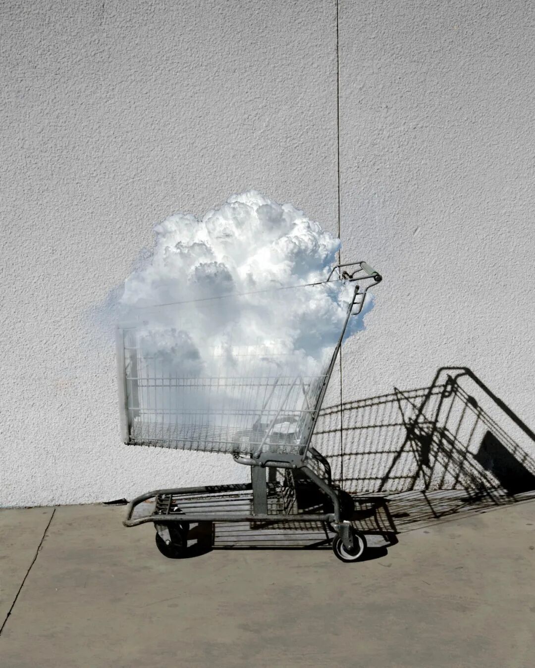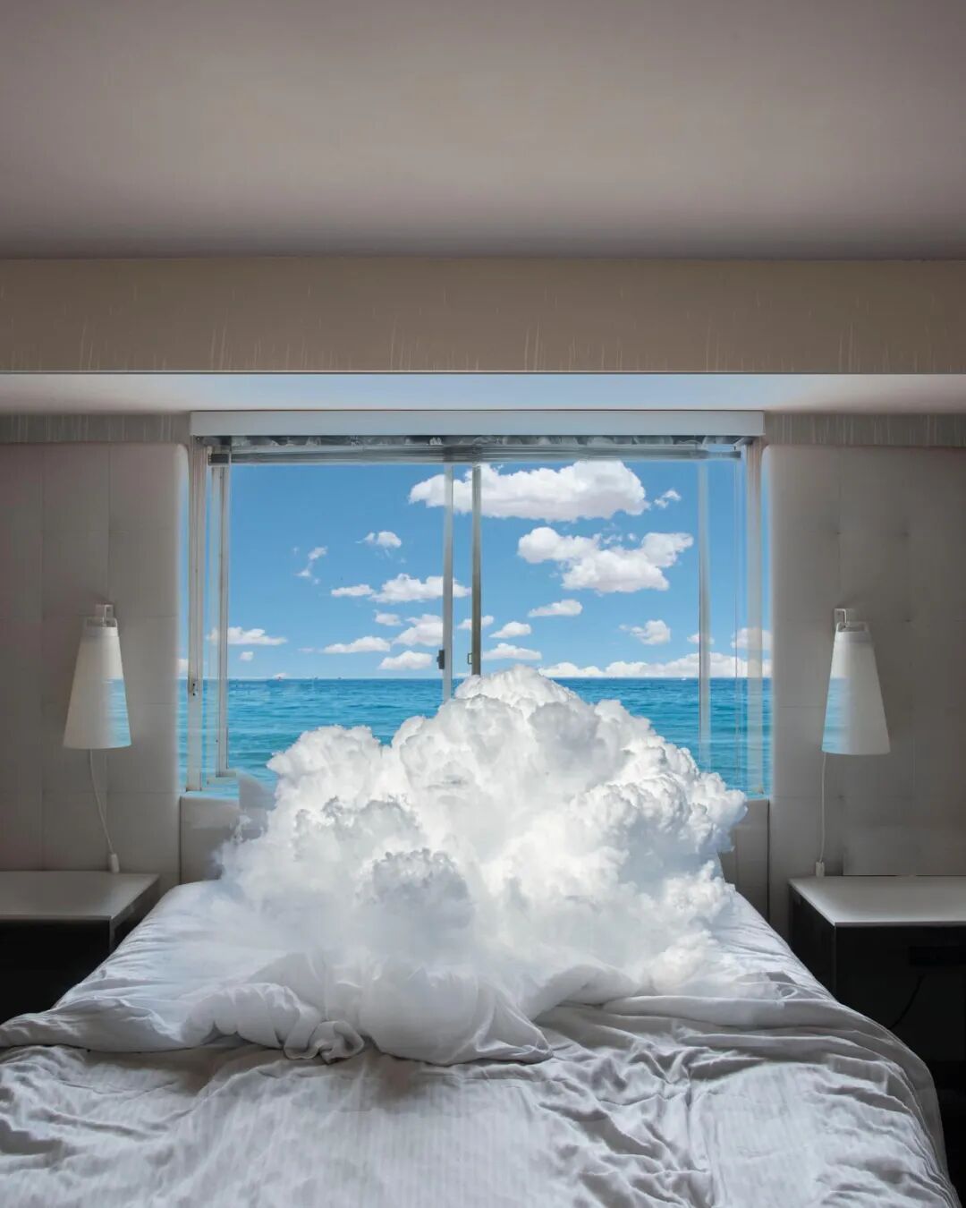 在金康熙的云彩系列数字作品中,我们可以看到洁白的云彩被装进购物车,还有一朵云彩从铁丝网的缝隙中钻了出来;甚至,我们还可以看到有一朵“大胆”的云彩,睡在人类的床上。