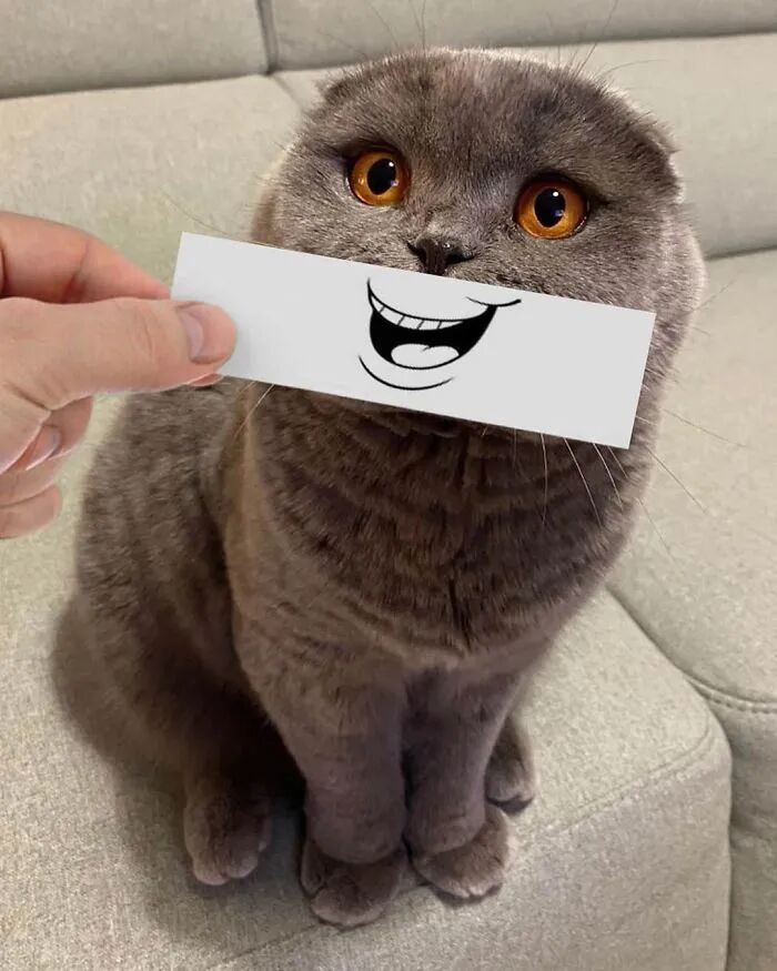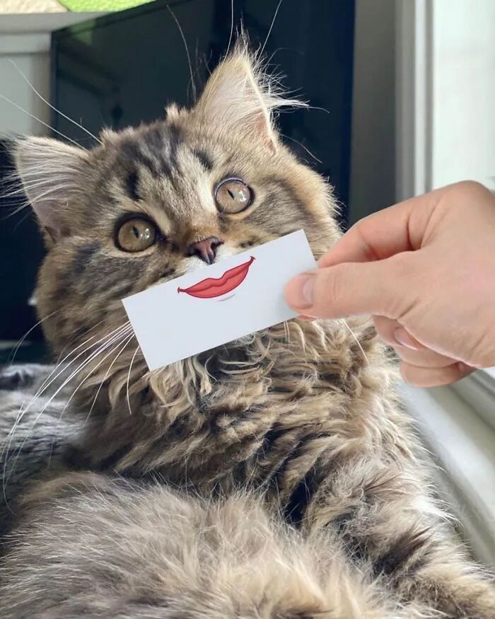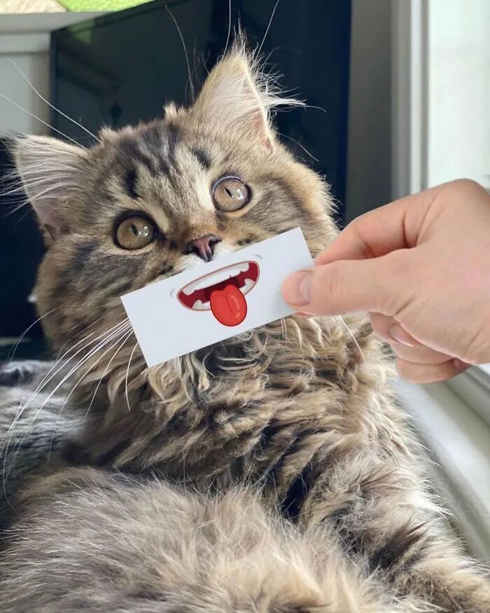 这种装扮的方式很简单,只需要一张细长的白纸,在白纸上画上不同的表情,例如,大大的眼睛、大笑的嘴巴、狡诈的神情等等,再用这些纸条遮住猫对应的位置,它就会呈现出你所画的表情。