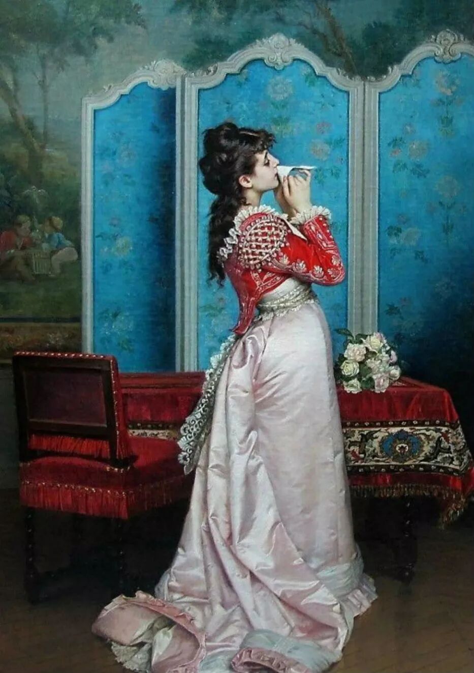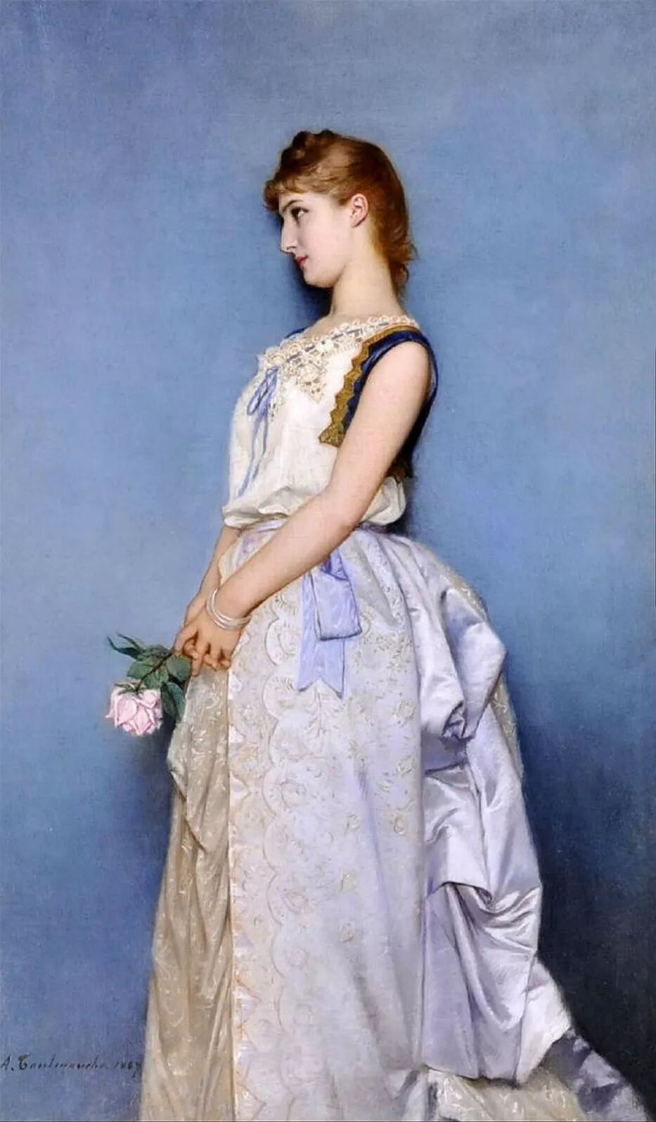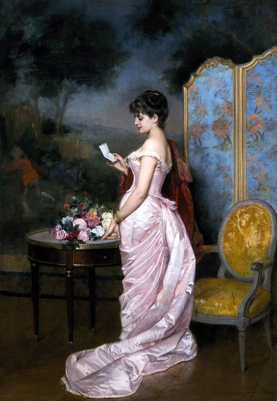 著名的法国画家奥古斯特·图尔穆奇,是一位专注绘画巴黎优雅女性的画家,在他的作品中,我们可以看到一个明显的特质,那就是在画面中的女性人物,绝大多数都是侧脸对着观众。