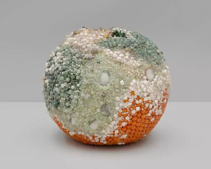 凯瑟琳·瑞安的雕塑作品,使用的材料大多是珍贵宝石,她用这些珍贵的宝石,模仿发霉的水果,其中有芒果、梨、苹果等等。用不同颜色的宝石制作成一个个霉变的水果。