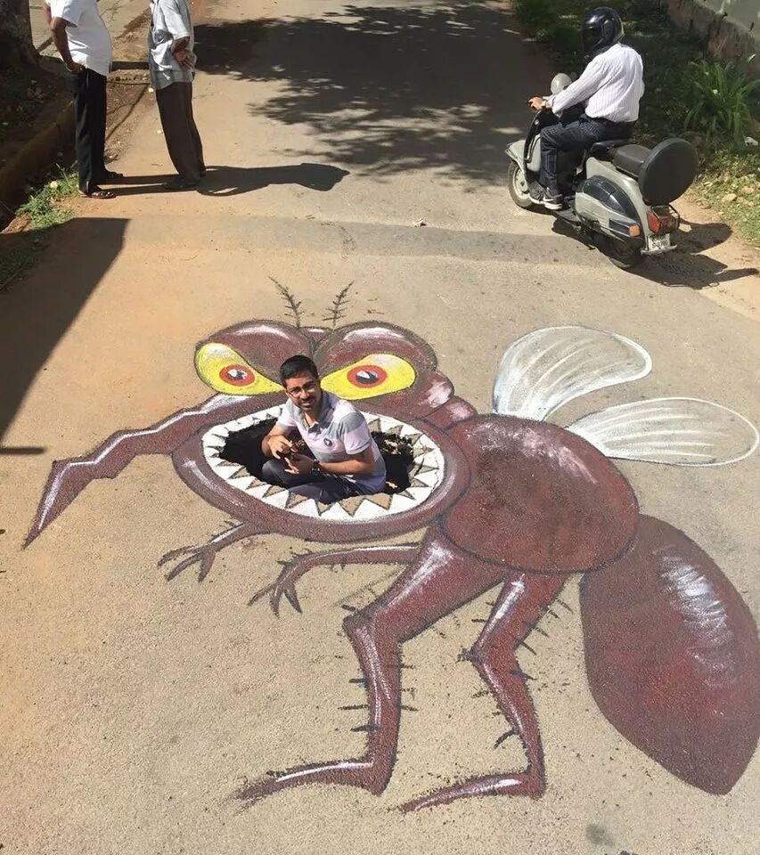 这位艺术家就是印度画家巴达尔·南俊达斯瓦米,他每遇到一条有坑洞的路,就在坑洞的周围画画,他的3D绘画创作极富想象力,不仅有趣,而且鲜艳的配色能够引起行人的重视,从而注意到街上的坑洞,从而及时避让。