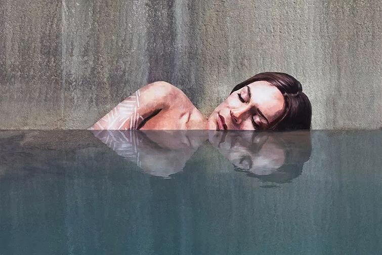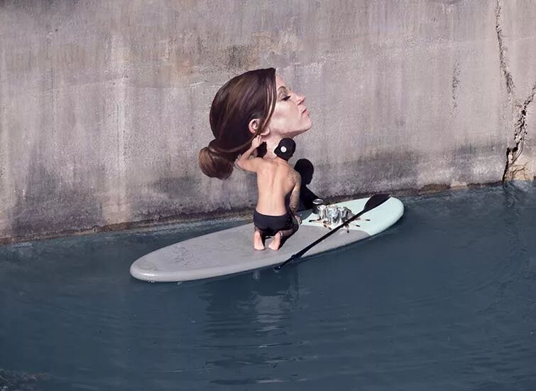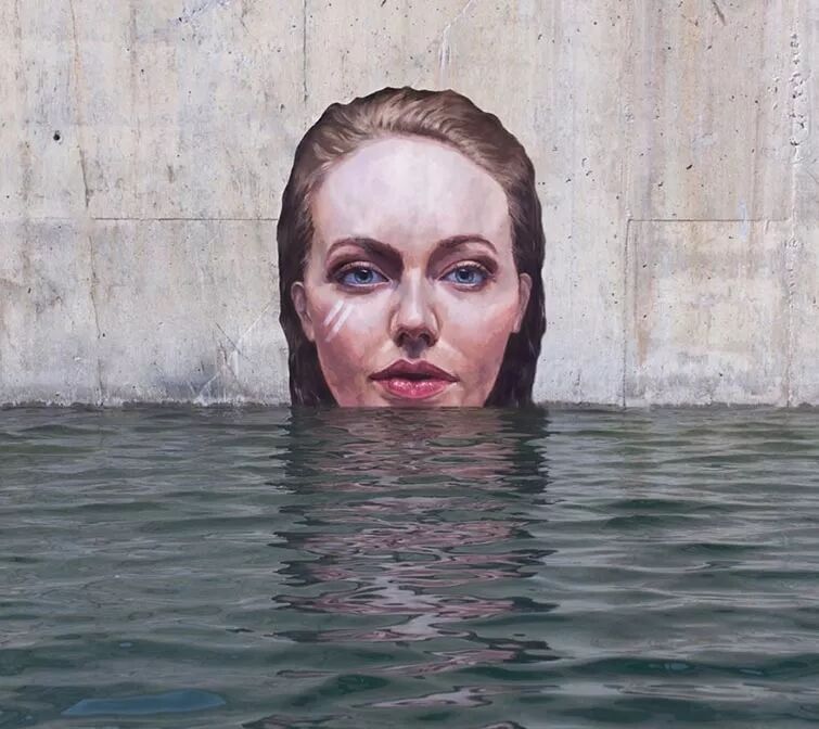 肖恩的这个主意简直绝妙,他划着冲浪板将自己和绘画材料,运到与海紧挨的墙钢筋混凝土材质的壁、桥洞等等,然后在上面绘制出一幅幅巨大的,以女性肖像为主题的街头艺术壁画。