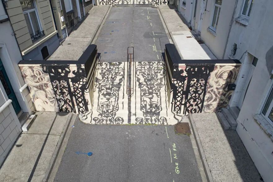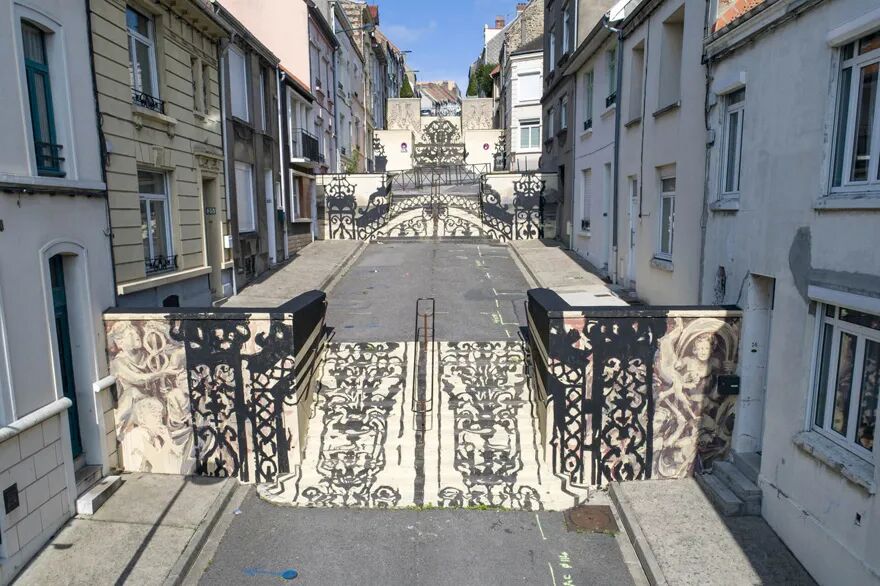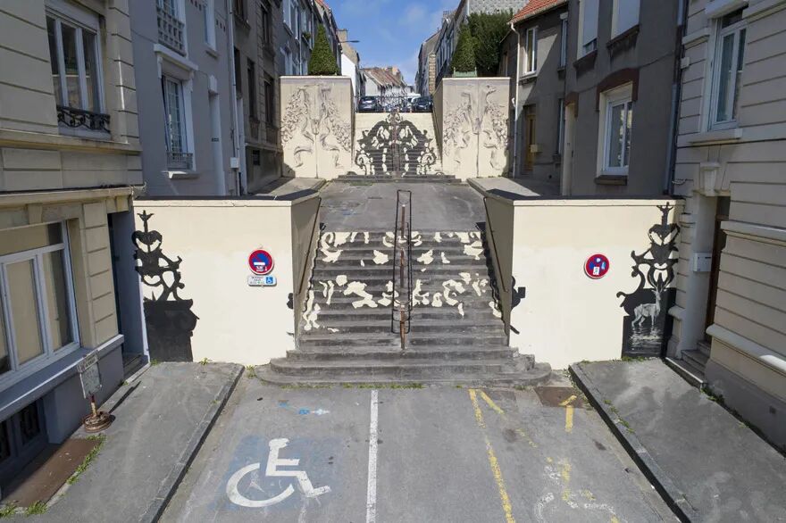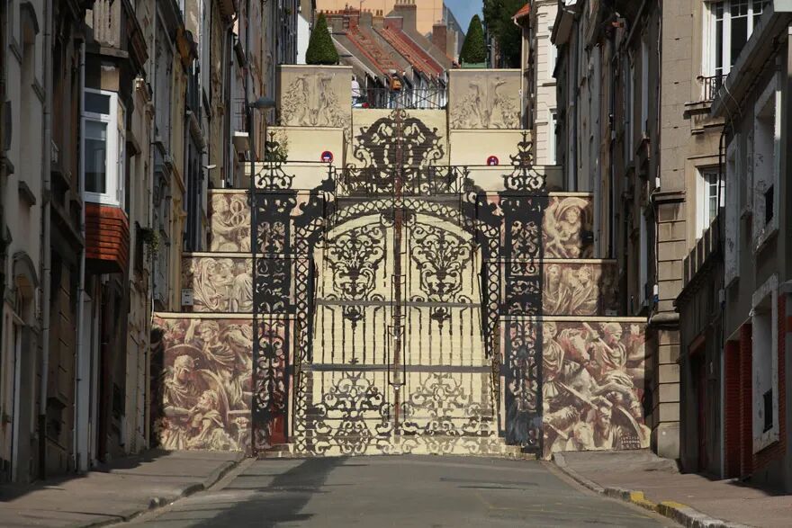 大约在去年10月份,贡萨洛·博隆多在法国滨海城市选择了一条特别的街道,在这个街道上有许多旧楼梯,而贡萨洛·博隆多的画作就画在这些旧楼梯上,通过这种方式欺骗了我们的视觉,让我们将这幅画作误以为是一扇铁门。