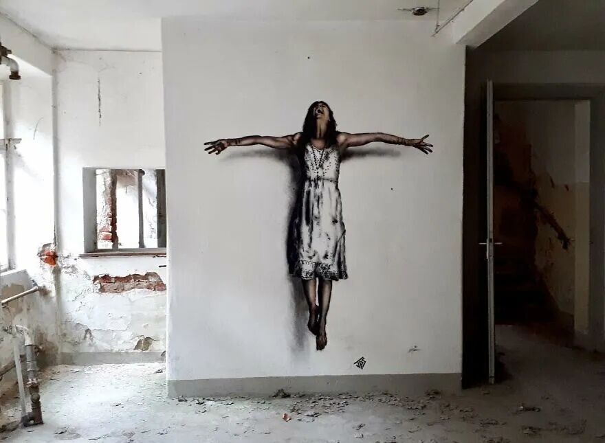说回这位艺术家的街头涂鸦作品,他的作品大都能够与周围的环境进行完美的融合,不会显得突兀,却让枯燥的场景变得妙趣横生。杰米·保罗·斯坎伦的创作主题非常丰富,从流行文化栩栩如生的电影角色,到巨大的超逼真恐龙、微型涂鸦,还有充满立体逼真视觉效果的3D墙绘,他的每一个作品都能够带给人们震撼和惊喜。