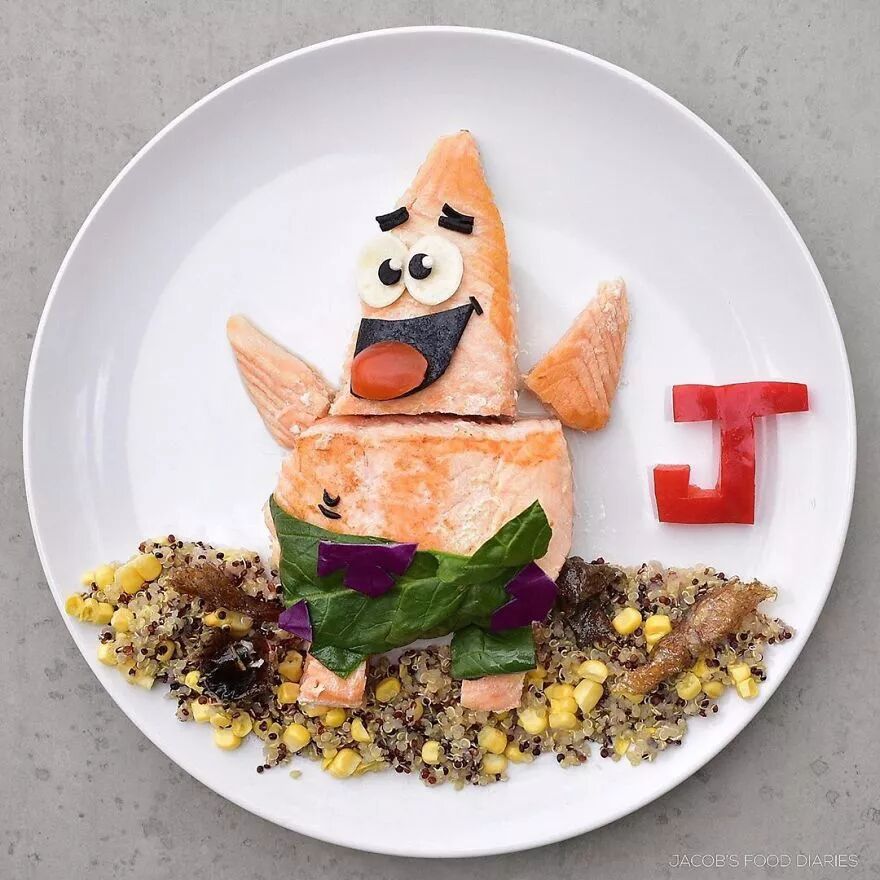 派大星,所需食材为野生澳大利亚鲑鱼、粗麦饭、菠菜、玉米、红辣椒和鲑鱼皮。