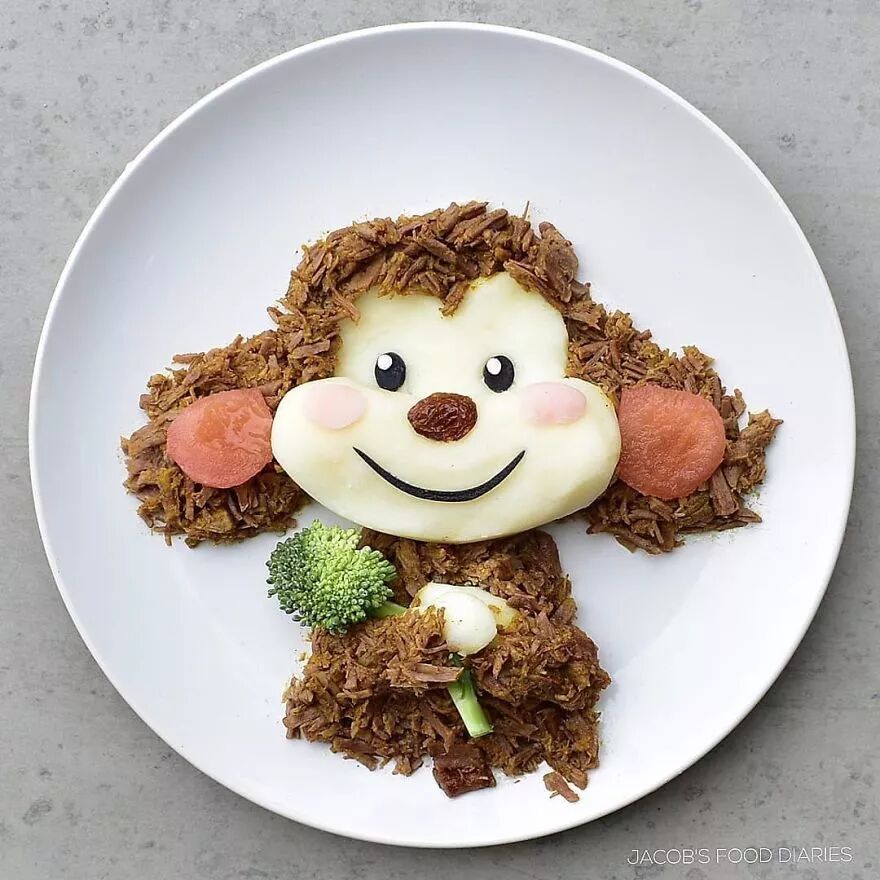小猴子,所用食材为土豆泥、番茄、花椰菜、炖羊腿。