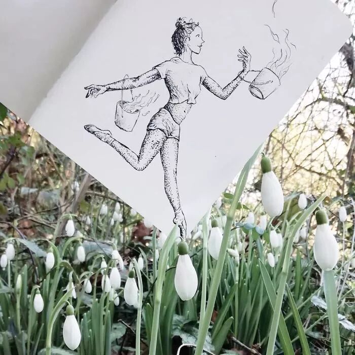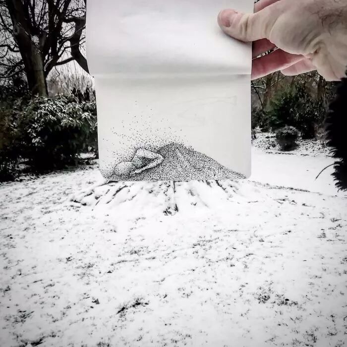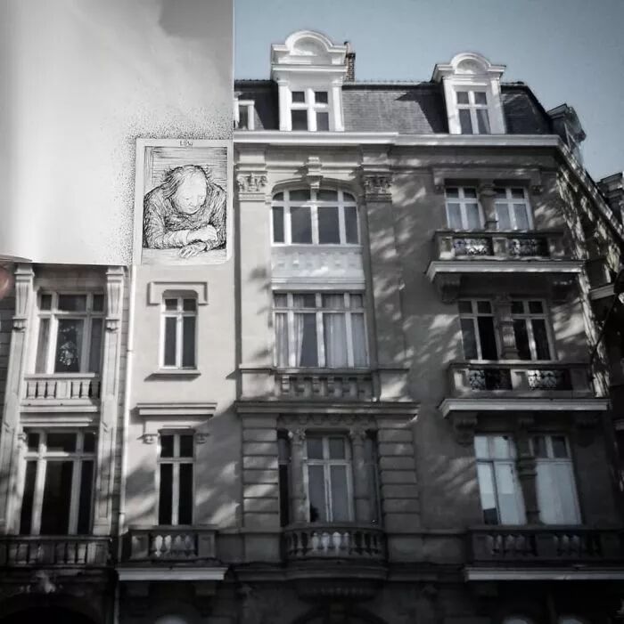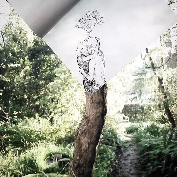 在特定的角度,洛伊斯用相机拍下来。这种速写与现实场景结合而成的“混合照片”,变得非常生动,充满趣味。