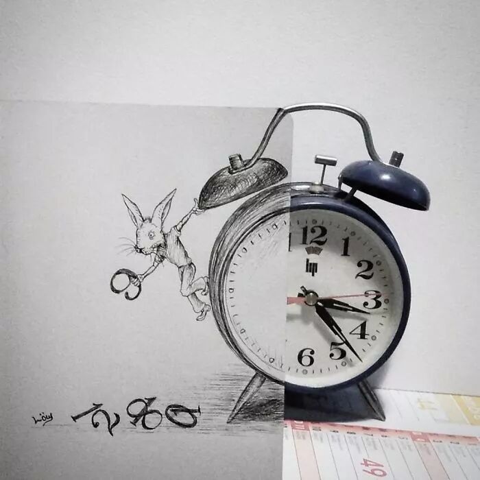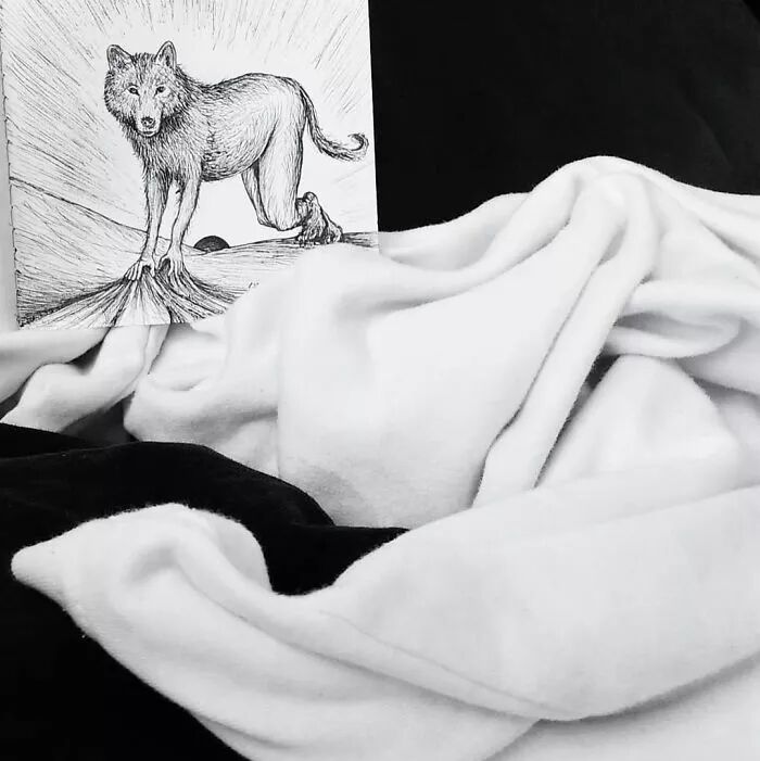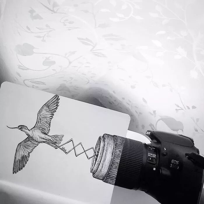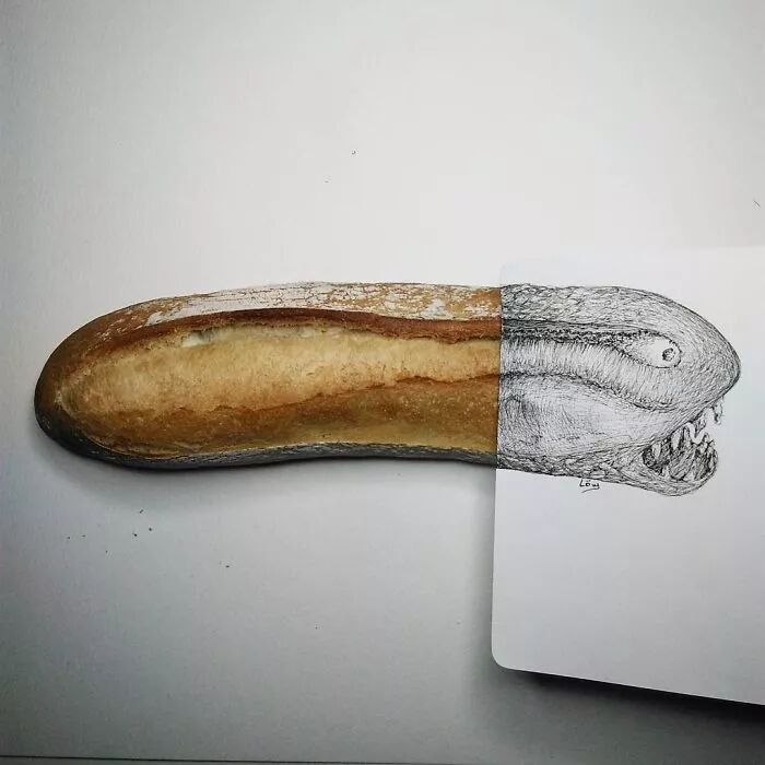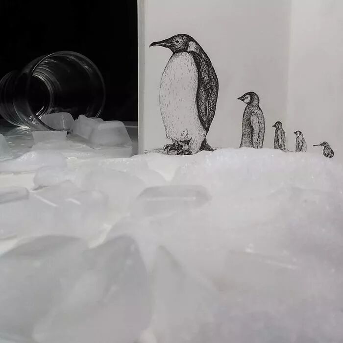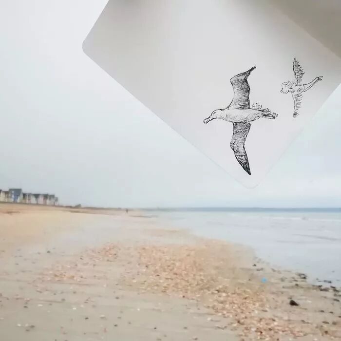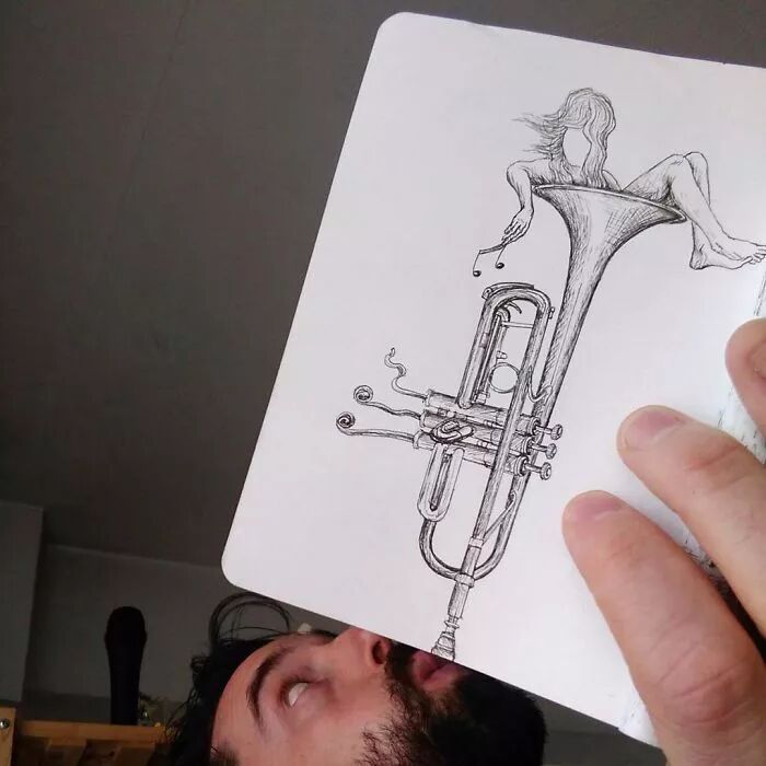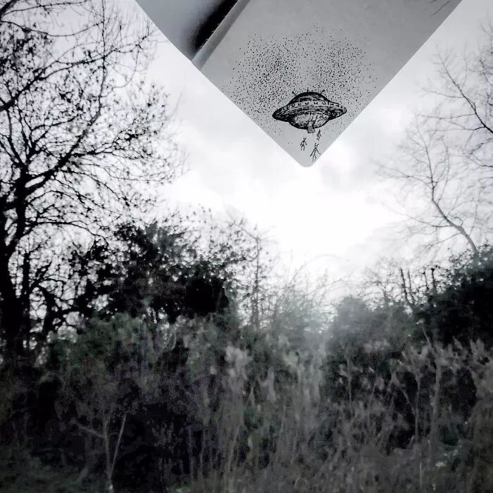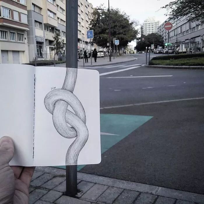 他将目之所及的一些事物、场景,用速写本遮住一部分,然后将遮住的部分用笔画出来,形成一个全新的,充满超现实感的新作品。