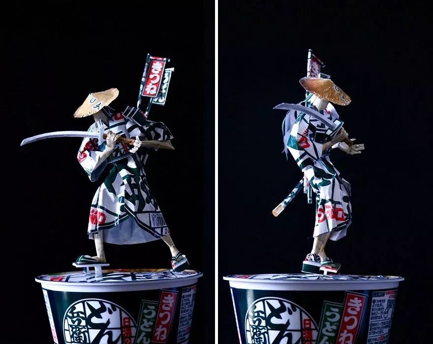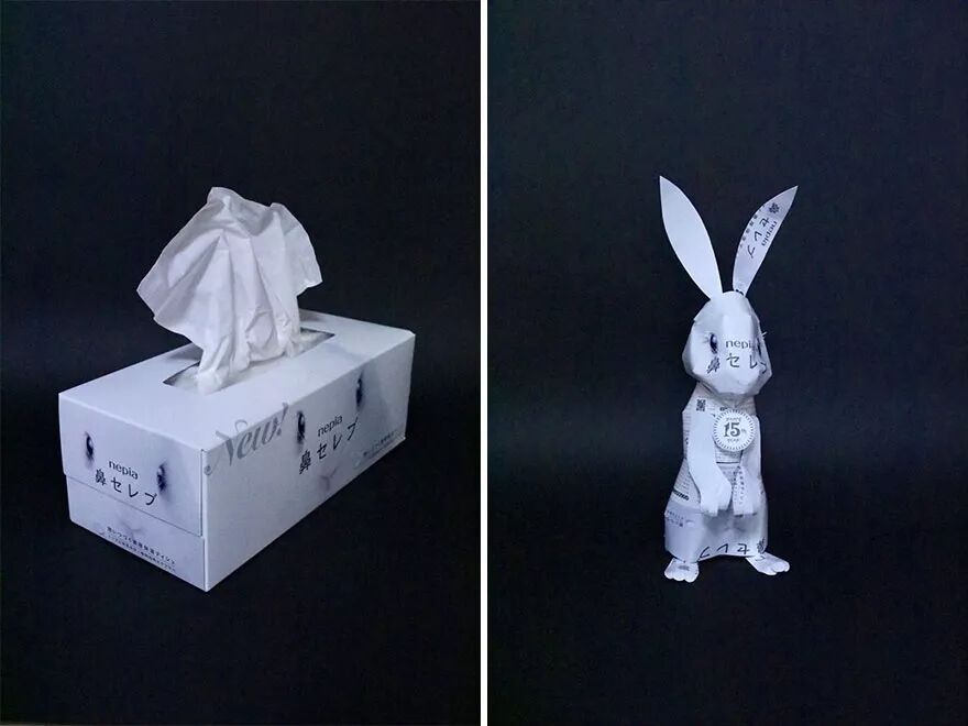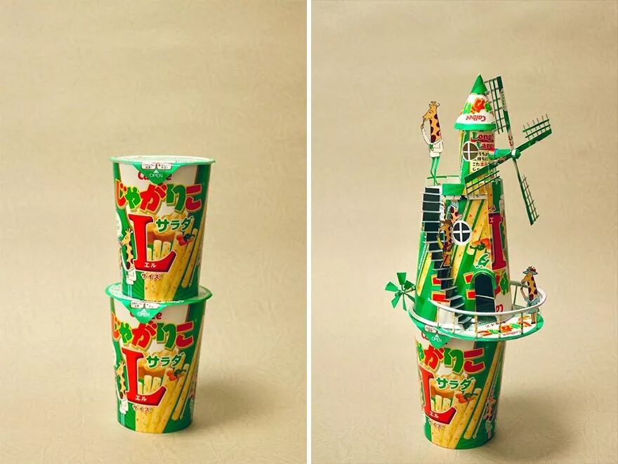 Haruki将废旧的产品包装纸或包装盒拆开,然后用剪纸、折纸等艺术形式进行再创造,最终这些垃圾完成了艺术的升华,成为一个个工艺品。仔细想象一下,你在打开食品包装盒,化妆品包装纸之后,将它们作何处理了呢?都当垃圾扔掉了吧?