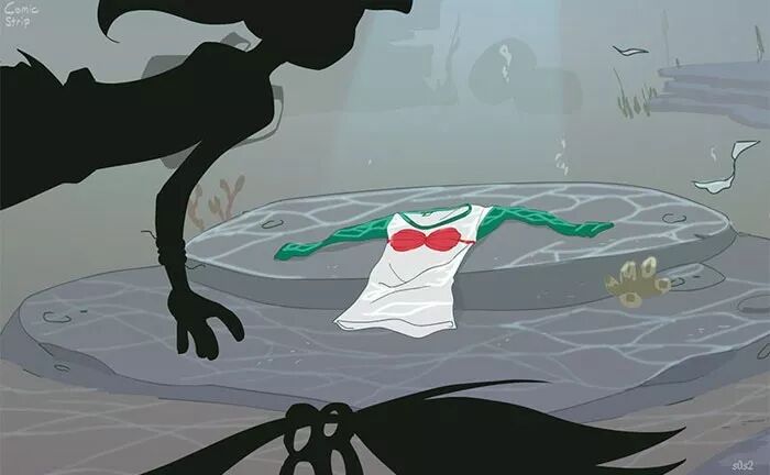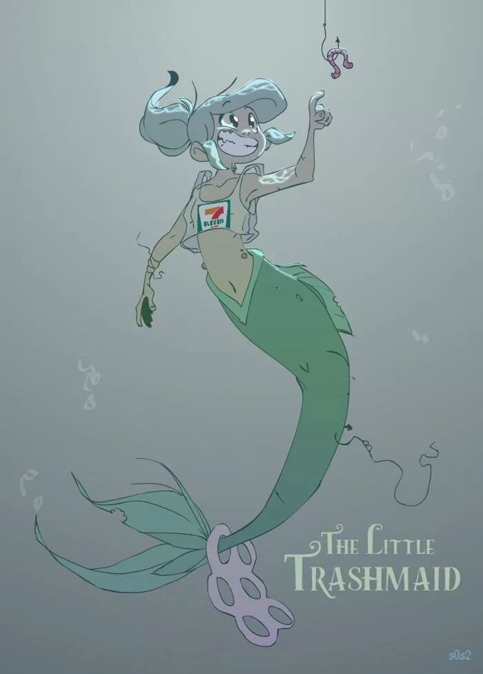 大家小时候一定都读过安徒生的童话《小美人鱼》,讲述了人鱼公主与王子之间浪漫而凄美的爱情故事,德国艺术家斯蒂芬妮·赫耳墨斯用插画的形式,重新改编了这个故事,取名为《捡垃圾的小美人鱼》,画中的小人鱼天真无邪,让人看了却十分心疼。