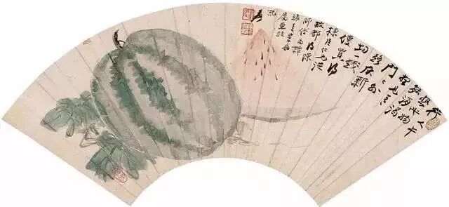 张大千,被西方艺坛赞为“东方之笔”,被徐悲鸿赞誉“五百年来第一人”,名号多如牛毛,在山水画方面卓有成就。这张扇面上的《西瓜图》用笔潇洒准确,线条的拿捏也恰到好处,凸显了水果的自然天成之趣。