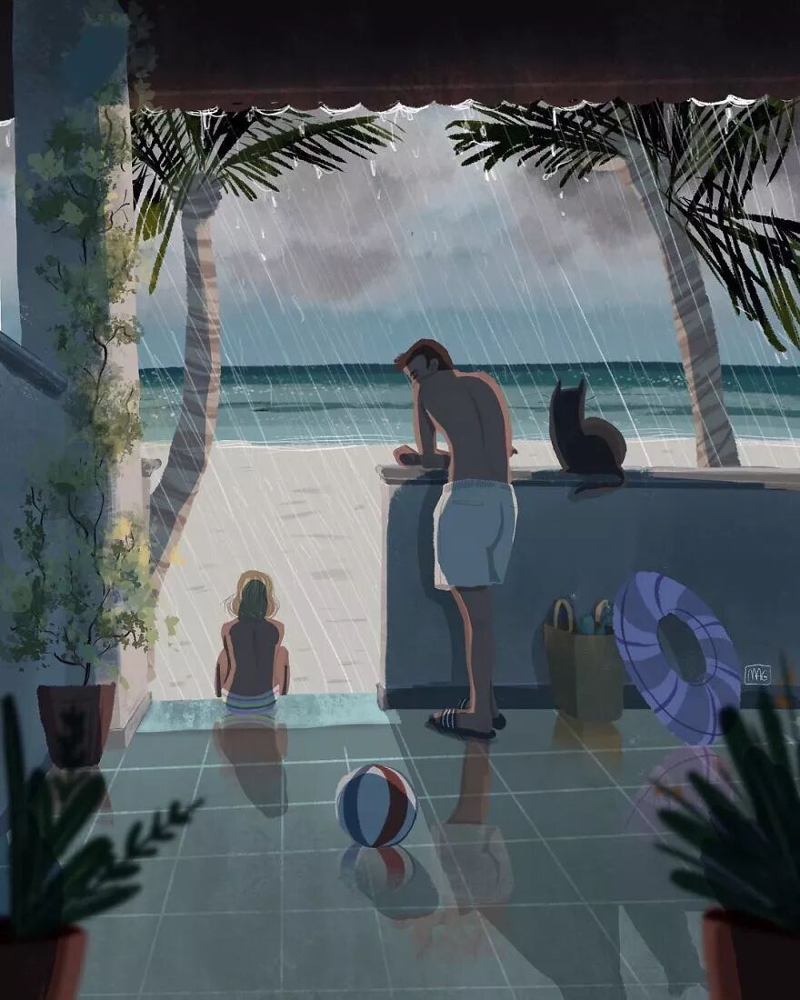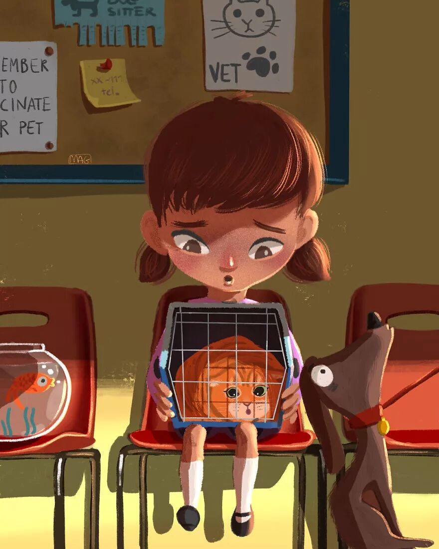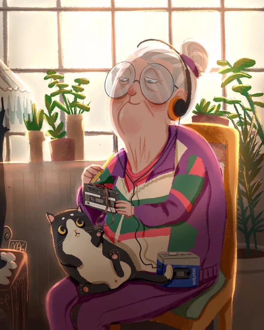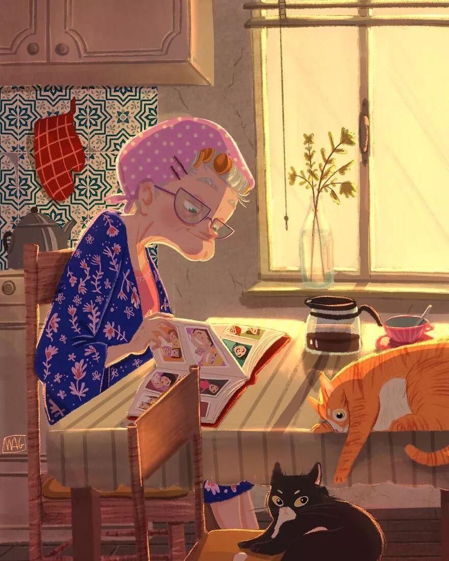 不论是它和孩子在一起嬉笑打闹,还是在听音乐的老奶奶旁边玩旧磁带,又或者是陪伴一家人享受家庭旅行,格拉索的画中的猫都是如此可爱,它见证了我们生活的点点滴滴,也参与到每一个幸福和喜悦的瞬间。
