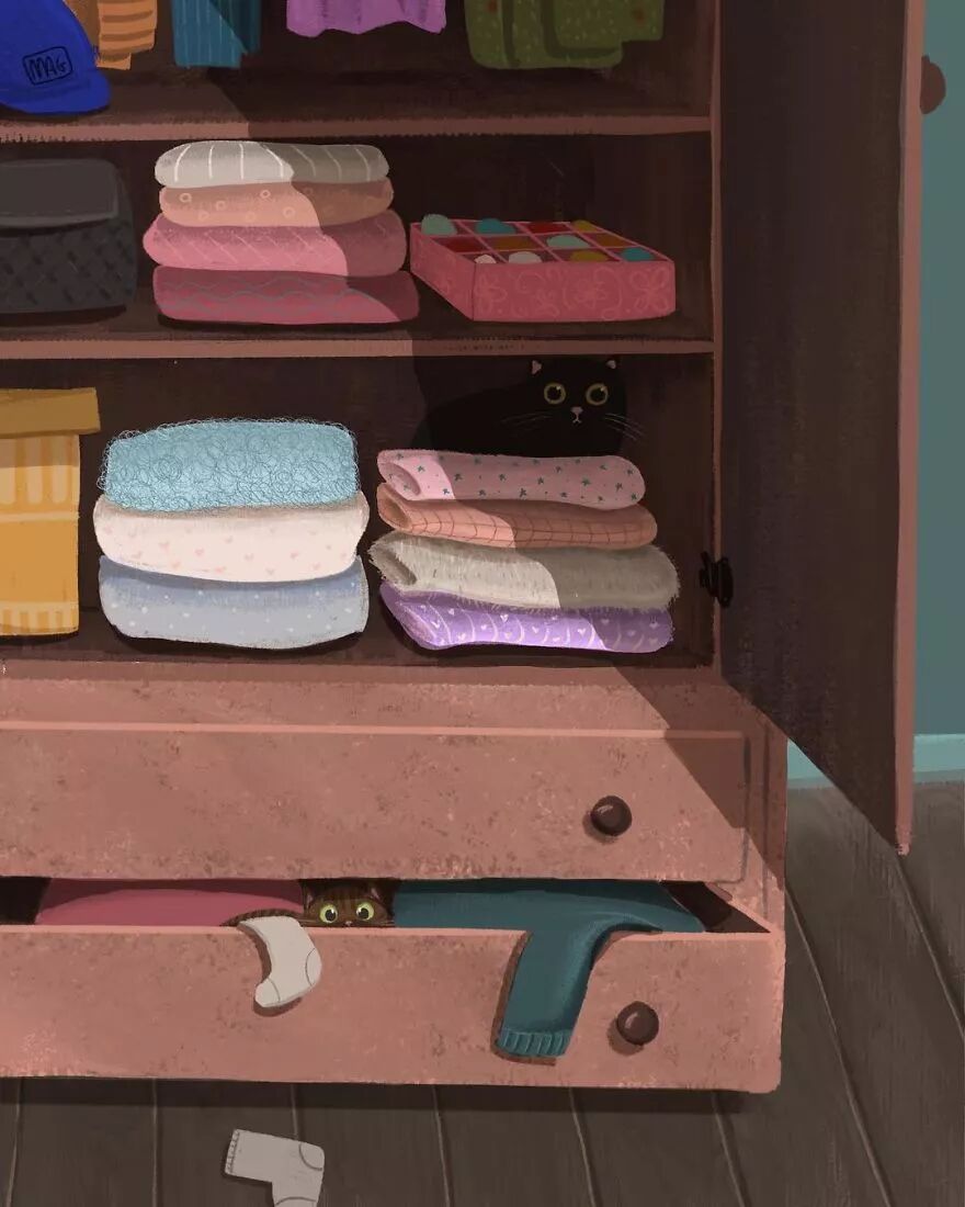 如果你也有一只这样可爱的宠物猫,一定要好好对待它,它会带给你十足的快乐和幸福感。一起欣赏艺术家笔下暖暖的插画吧。