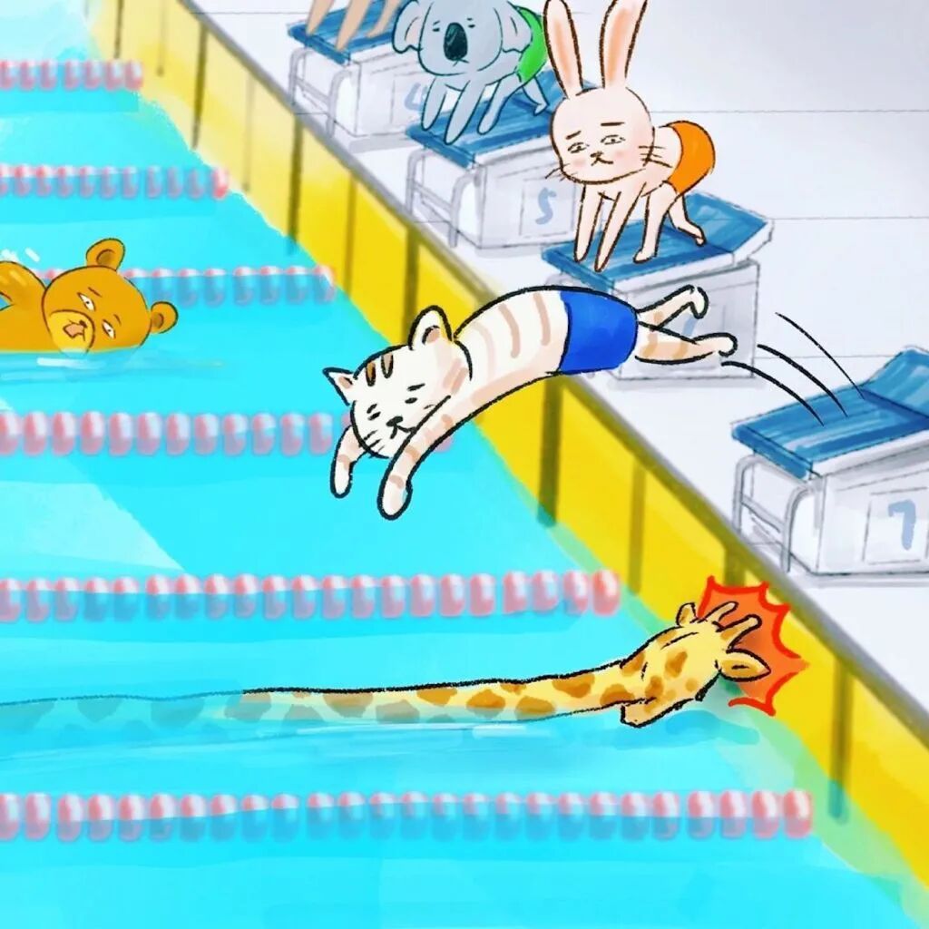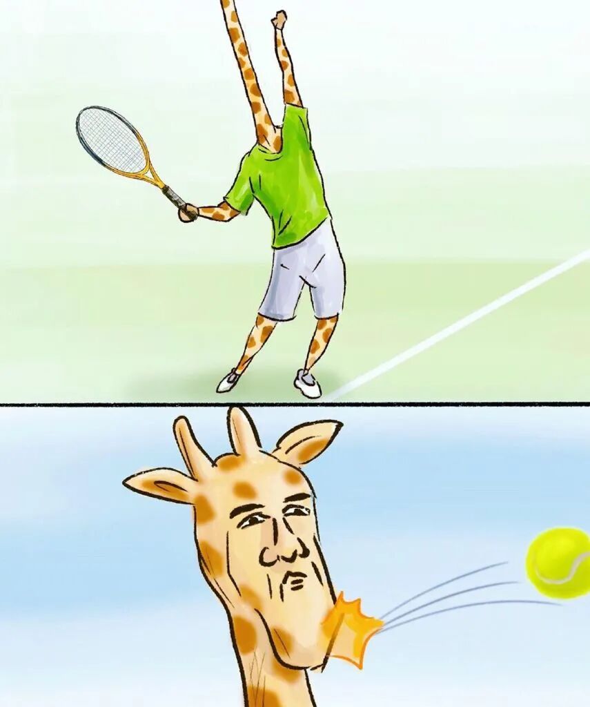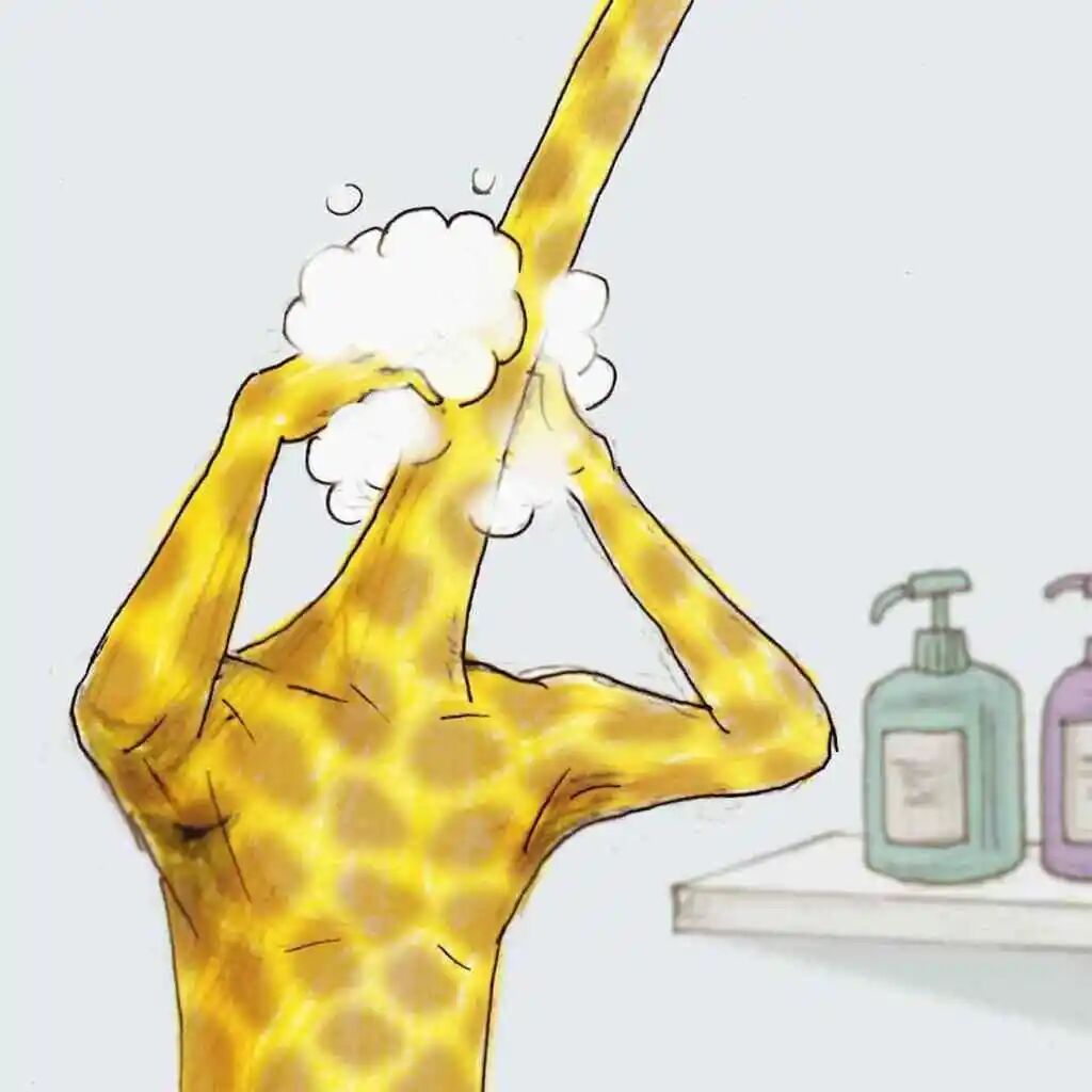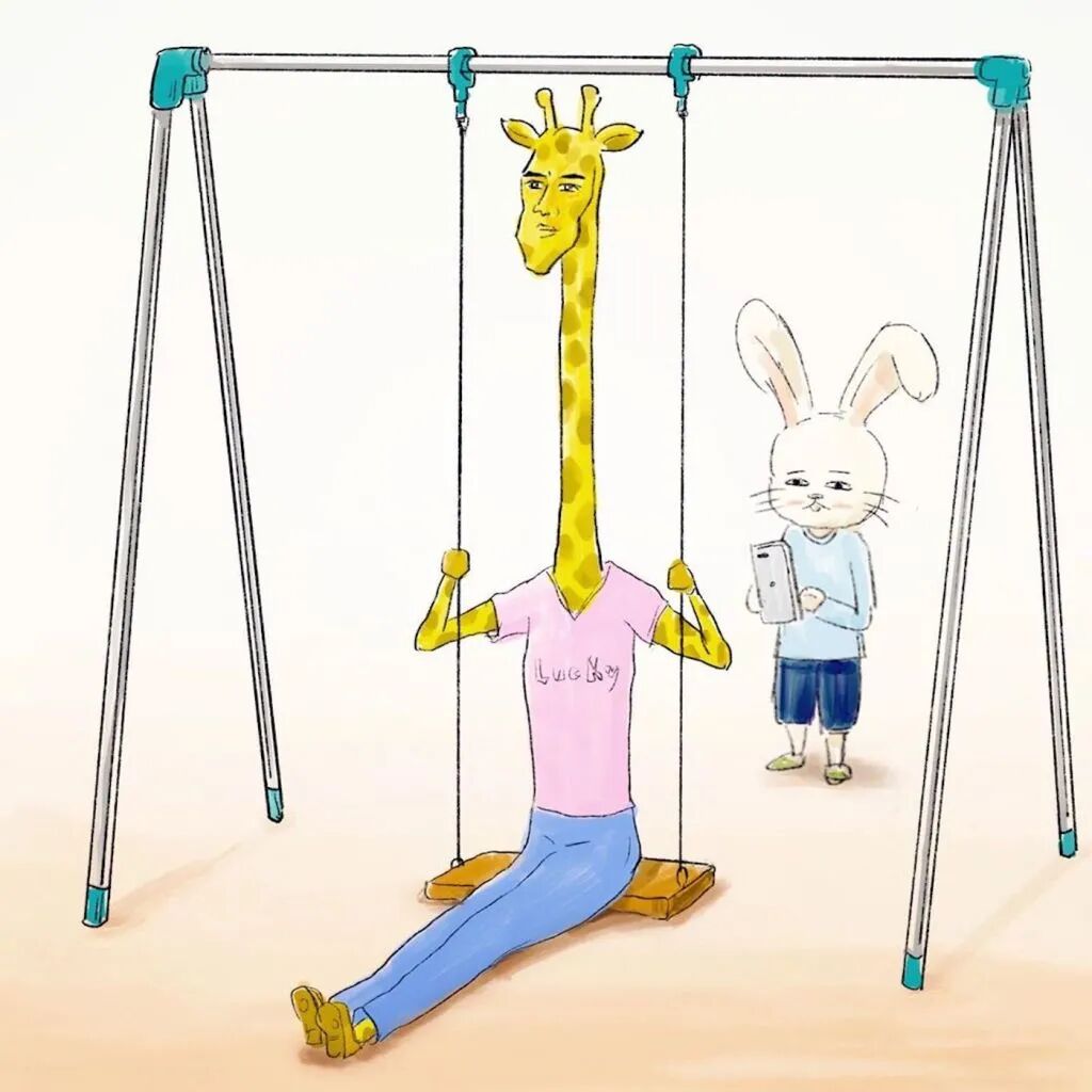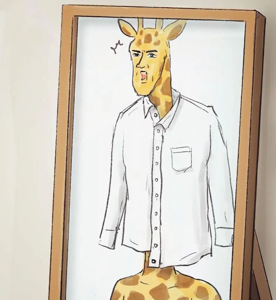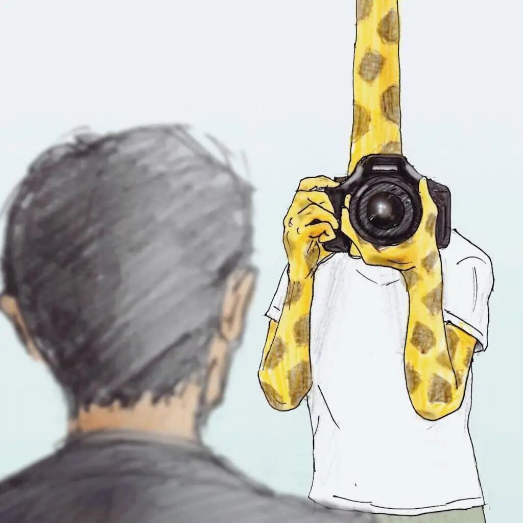 事实上,庆吾不仅仅创造了这只可爱的鳄鱼,在他画笔下还有一只非常可爱的长颈鹿,长颈鹿同样也是一种非常特别的动物,它拥有非常长的脖子,这样的长脖子可以方便长颈鹿吃到高处的植物,不过,对于长颈鹿非常实用的生理特征,如果换到人的身上就很怪异了。