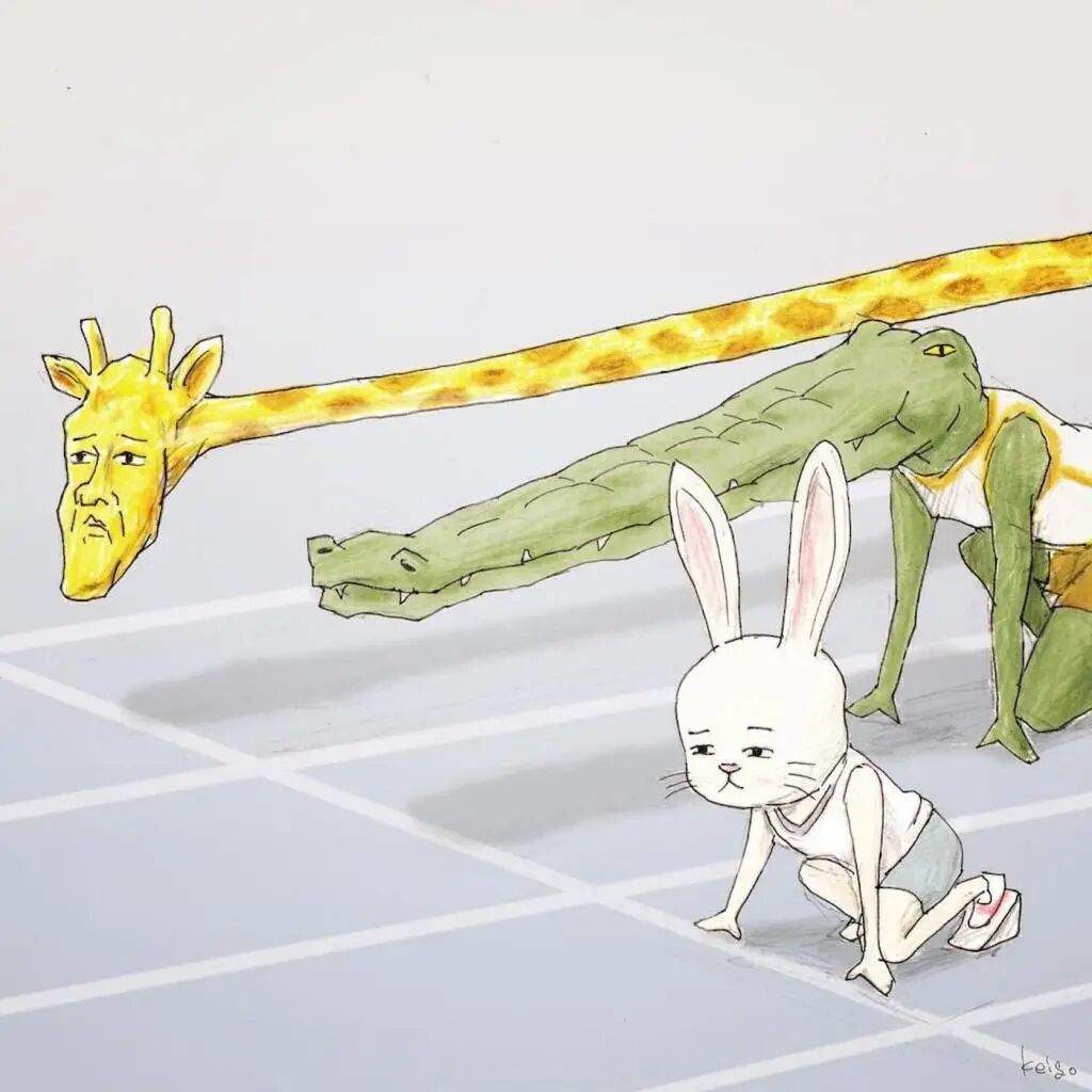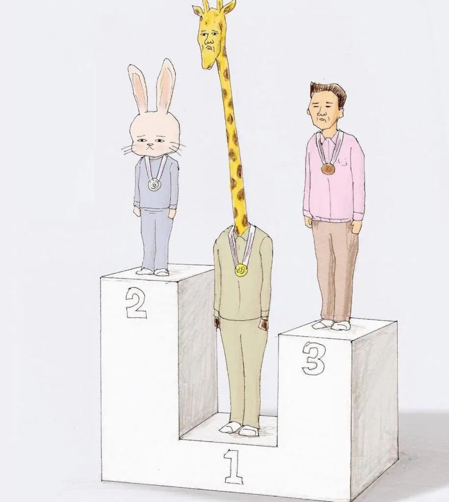 在庆吾的插画作品中,长颈鹿在拍照、在运动、在做游戏,每一个场景都被它的长脖子所影响,许多人都看到庆吾插画作品中的有趣之处,但是,只有少数人能看到庆吾趣味插画作品背后的含义,庆吾认为,在他的画作中,无论是鳄鱼还是长颈鹿指的都是人类。