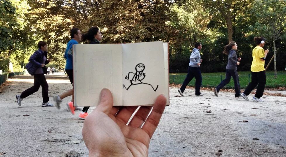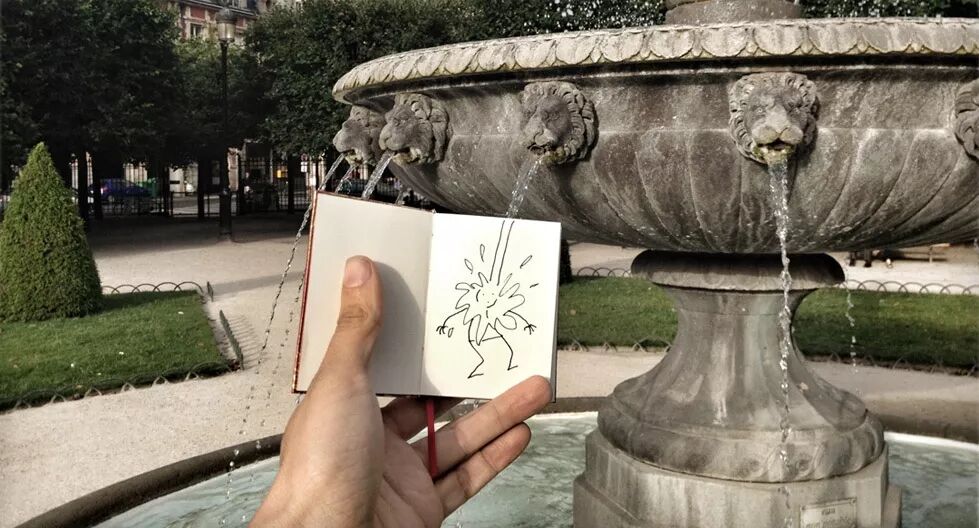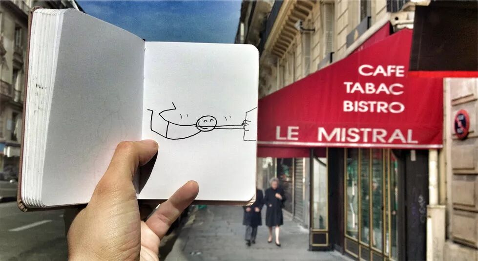 每到一个触发他灵感的场景中,他就把自己的速写本拿出来进行即兴创作,他画出的调皮小人儿与周围的环境完美融合,还能产生有趣的互动。最后,Yacine再把这个充满童趣的场景拍下来。