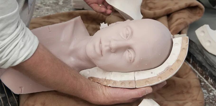 到这里可不是结束,铸模与开模才是重头戏,也是最关键的步骤。身体和头部被注入不同的材料,头部是柔软的蜡以便于后续缝制毛发,身体部分使用了更加坚硬的材质,以抵御无数次的重复触摸。