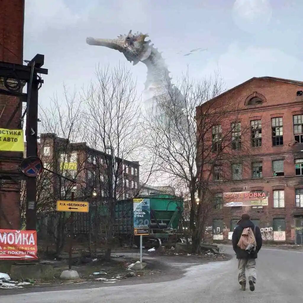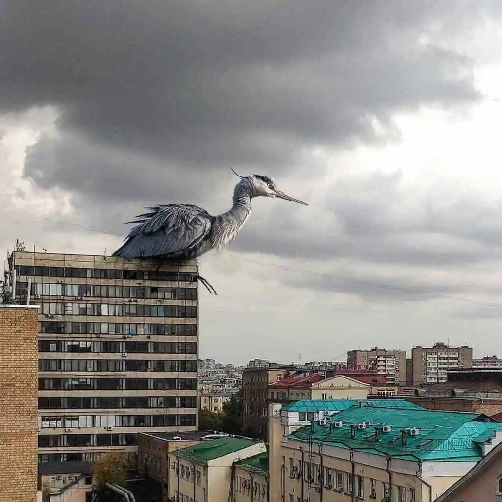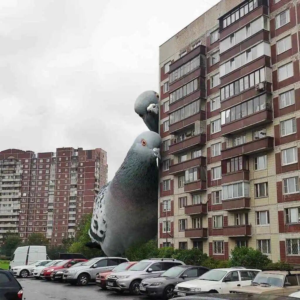 来自俄罗斯的艺术家瓦迪姆·索洛维约夫就创作了一组极具现实意义,并能让人产生反思的蒙太奇摄影作品。在他的作品中,动物的体型变得数倍于人类,但人类的场景却没有变化,一只鸽子就比一整栋楼还要高,一只章鱼可以塞满一辆巴士,一只蜗牛则可以占据整条街道......