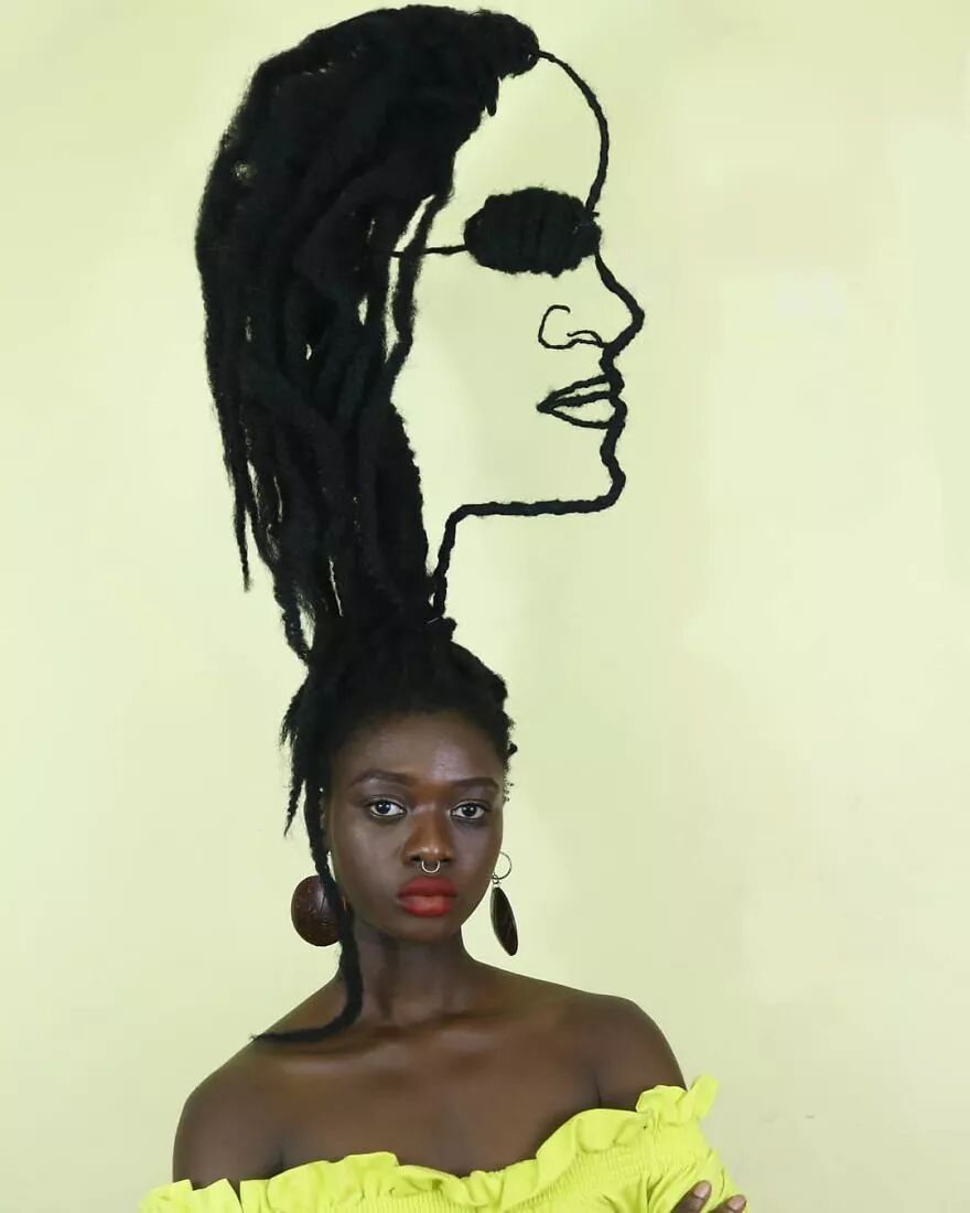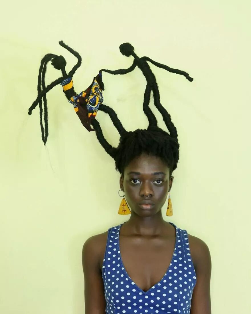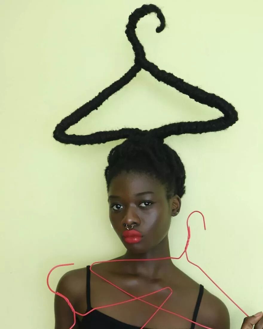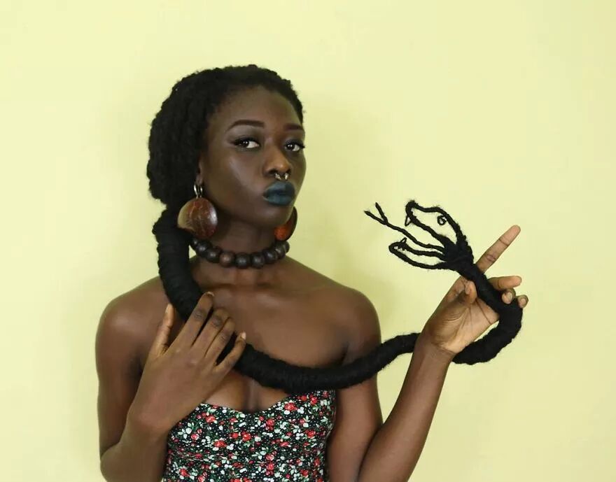 22岁的科特迪瓦艺术家莱蒂西亚·基受这种经验灵感启发,将头发带到另一个层次。她通过头发的延伸,加上针线、织物、金属丝、羊毛等材料的辅助,创作出了一个个滑稽搞笑、异想天开的头发雕塑。