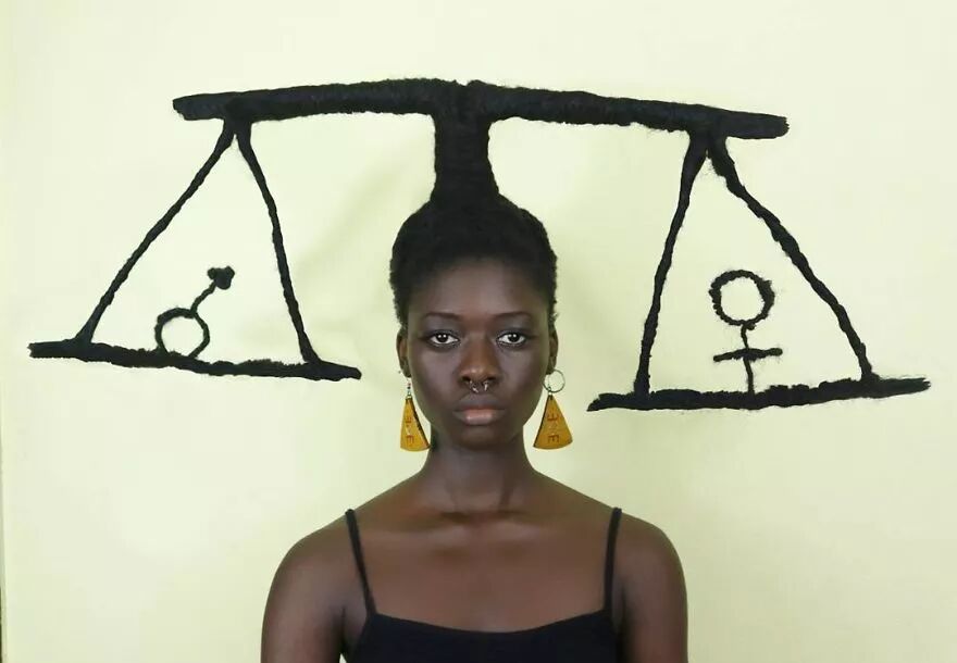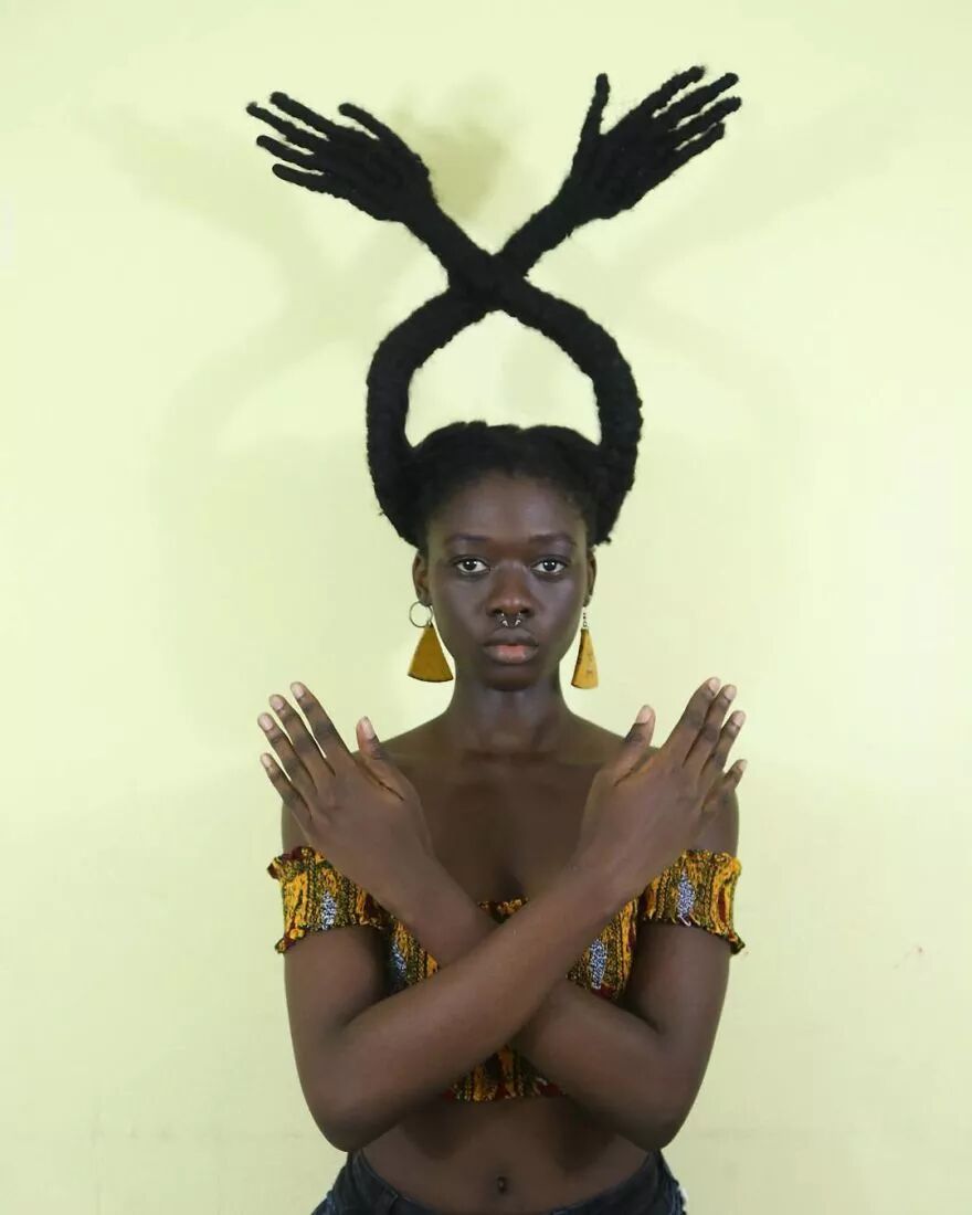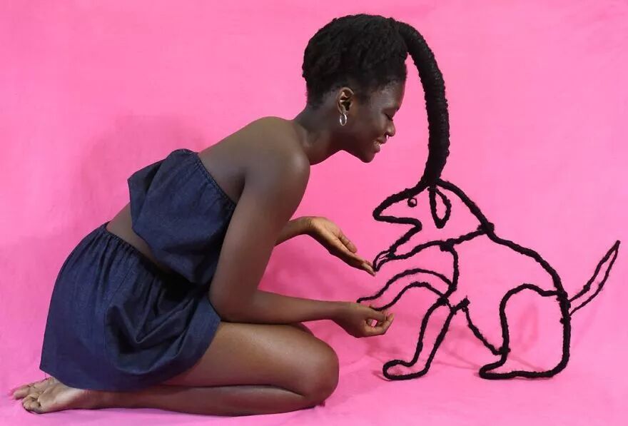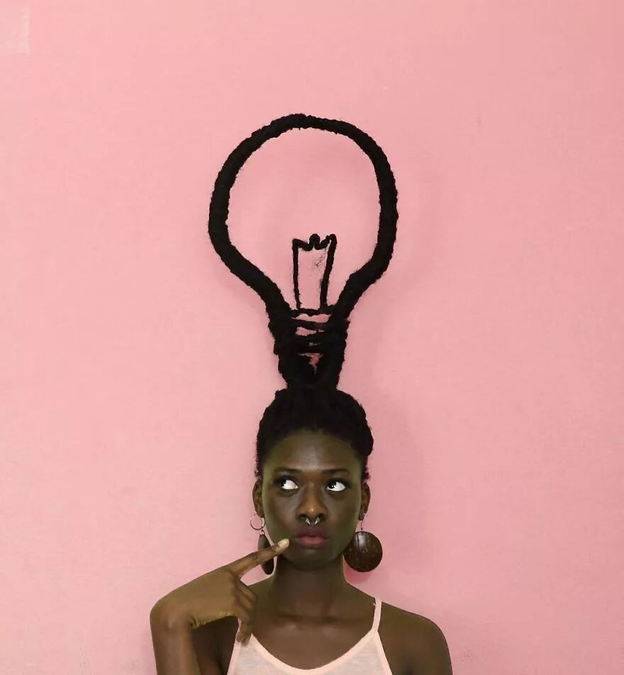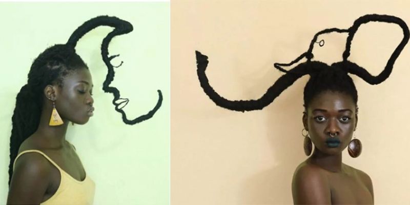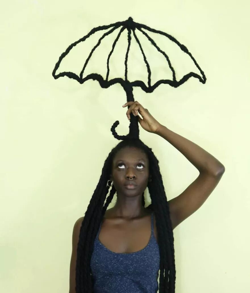 22岁的科特迪瓦艺术家莱蒂西亚·基受这种经验灵感启发,将头发带到另一个层次。她通过头发的延伸,加上针线、织物、金属丝、羊毛等材料的辅助,创作出了一个个滑稽搞笑、异想天开的头发雕塑。