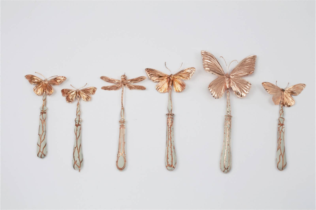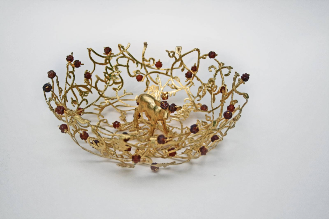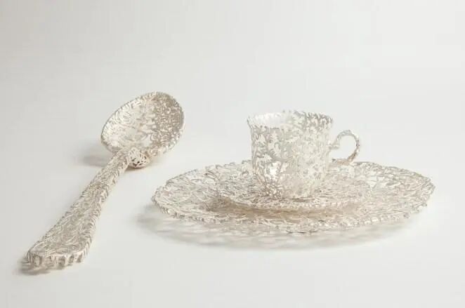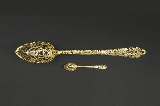 欧洲一位名叫威贝克·默勒的美女珠宝艺术家,从历史悠久的欧洲银器、金器和瓷器作品中汲取灵感,纯手工打造了由金银花丝制成的华丽至极的餐具,令人惊艳不已。其实,花丝工艺我们都不陌生,在很多的首饰上也都见过这种工艺的应用,但,将这种工艺与餐具结合在一起,属实非常少见。