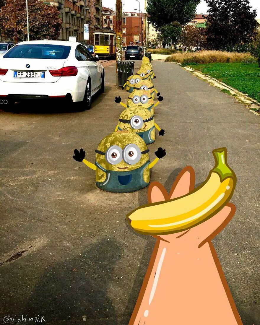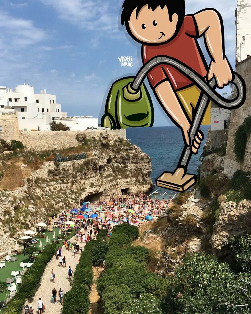 来自印度的维迪·奈克就是一位擅长从平凡生活中,寻找创作灵感的艺术家,她创造了一种有趣而聪明的方式,将自己画出来的涂鸦卡通人物置于周围的现实生活中,营造出生动、充满童趣的故事场景,给自己带来了快乐,也给别人的生活带来了快乐。