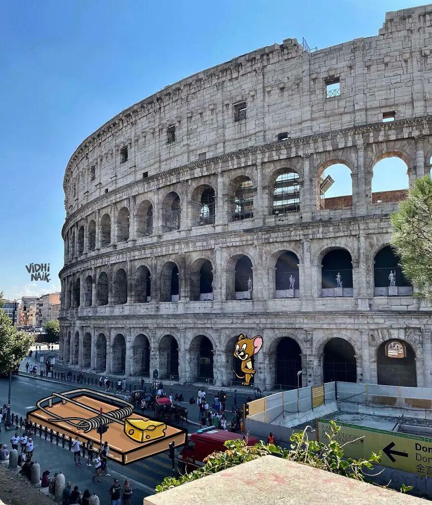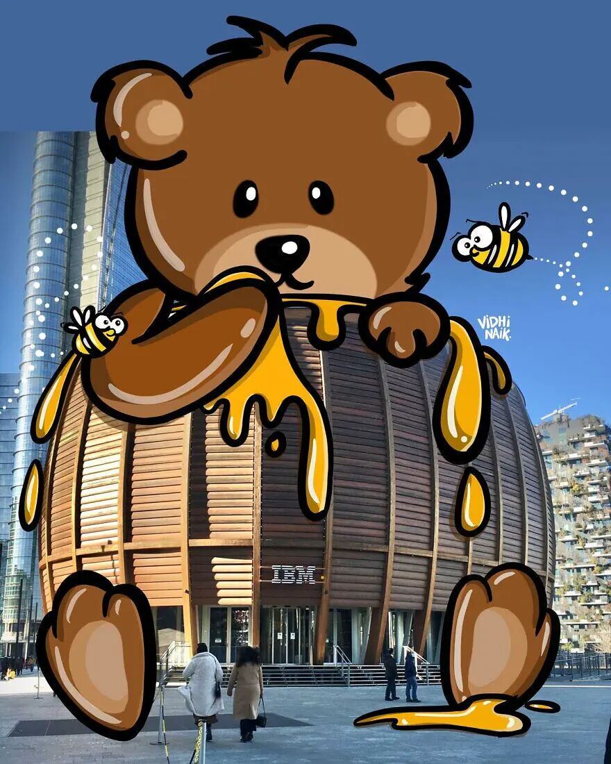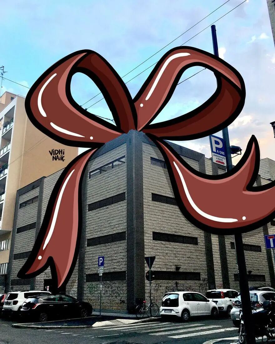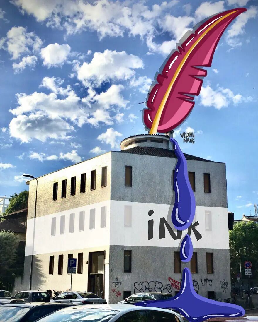这样充满想象力的场景,在维迪·奈克的作品中不胜枚举,其实,我们每一个人在生活中都能见到这些照片,比如建筑、街道,甚至斑马线等等,但是从来不会想到,加上几笔涂鸦,它们会变得完全不一样。很多人看了这位艺术家的作品,都不禁称赞,她拥有一颗热爱生活的有趣灵魂。
