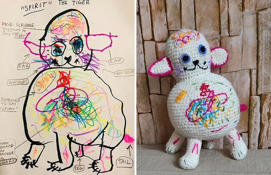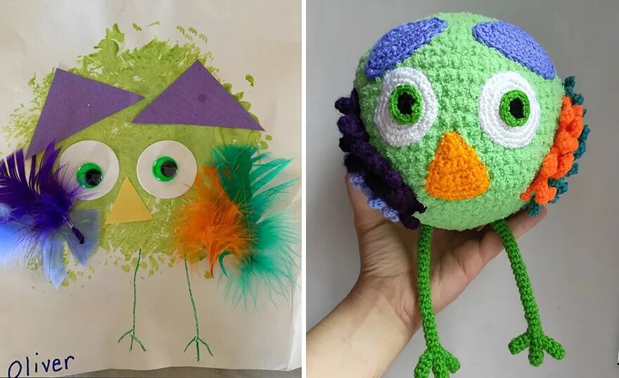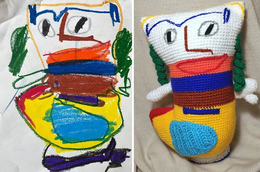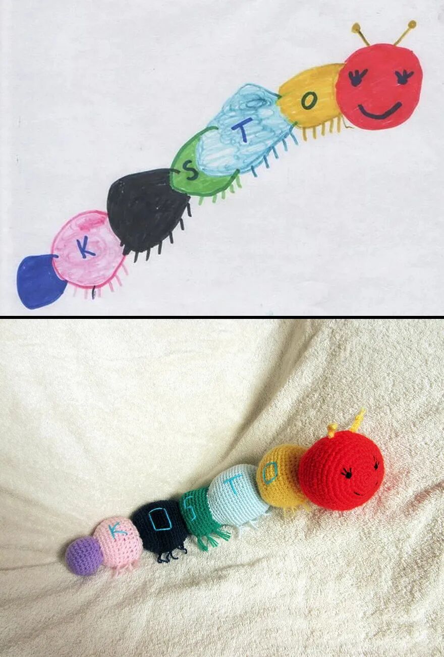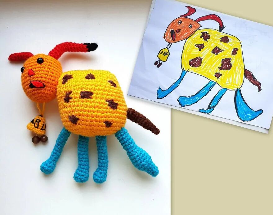 “他们是在用画笔探索世界,表达他们眼中的事物,我很喜欢孩子们的想象力。”有一天,维奥莱塔突发奇想,如果将他们画中的不明生物做成实物,一定能让他们成就感倍增。于是,这位艺术家开始在孩子的涂鸦画作的基础上,进行二次创作。钩针和毛线,是维奥莱塔使用的所有材料,她把孩子们的画变成了3D版的针织玩具,尽管这些玩具看上去丑丑的,但在孩子眼中它们是最好看的。
