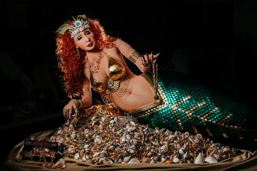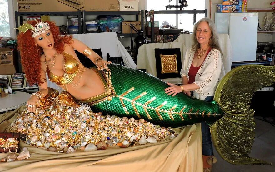 这个雕塑作品是一个体型巨大的美人鱼,她身长13 英尺(396 厘米),垂直高度也有9 英尺(275 厘米),拥有复杂的内置骨骼结构,四肢可以活动,可以摆出各种不同的动作。最值得一提的是,这个美人鱼雕塑的制作材料,五花八门,有手工制作的珠宝,沙滩上捡的贝壳,织物、还有旧金属等等。
