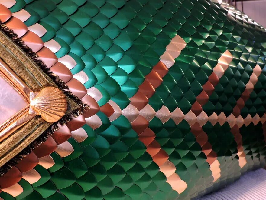 这个复杂的雕塑头部和身体都是由织物雕缝制而成,就像一个柔软的芭比娃娃,但是手上和头上的一些装饰,都是用真实的珠宝或者贝壳制作而成,最重工之处,就是美人鱼的尾巴上的鳞片,总共有四种不同的尺寸,覆盖了7000多片不同大小的鳞片,这些鳞片就是用金属制作而成的。