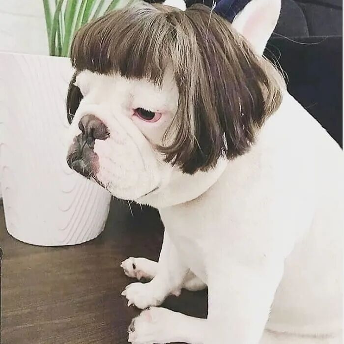 这些狗子的表现好像并没有如他们的意,它们戴上假发后的样子,一本正经又无可奈何,看上去并不可爱。但是,就是这些丑丑的照片,让人印象深刻,很多网友看完表示:“承包了一天的笑点”,“笑到飙泪”等等。