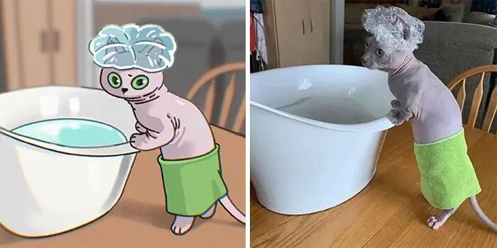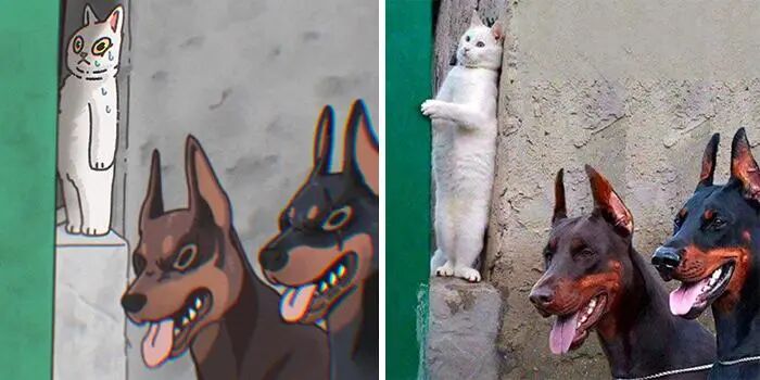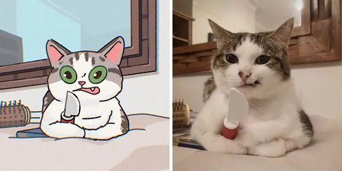 网红猫咪的照片被这位插画家改造之后,搞笑程度丝毫不减,可爱度倒是增加了不少,他在尽量还原照片的前提下,对猫的一些特点进行了适度的夸张,比如圆圆的眼睛显得很无辜,或者加上一些不灵不灵的效果等等,让人看了更爱了。