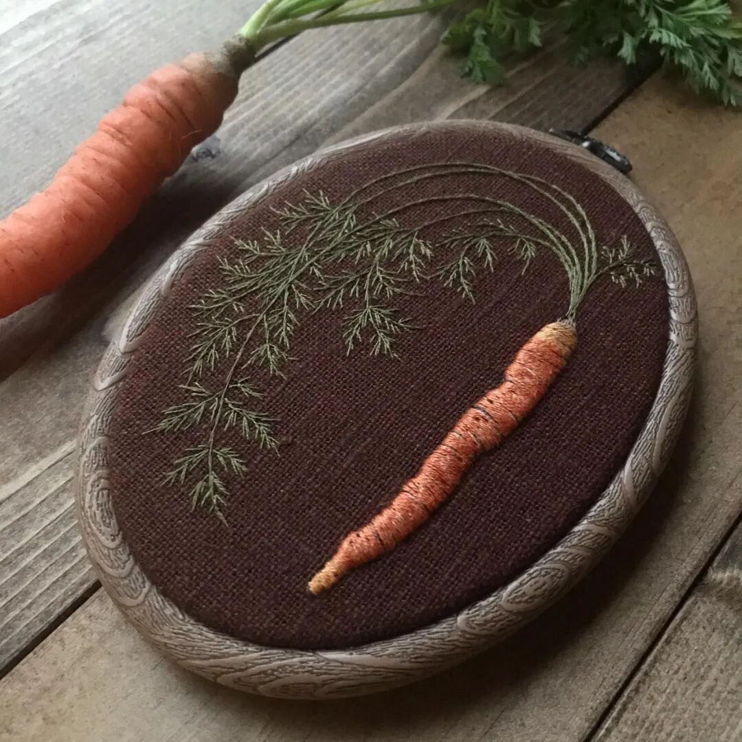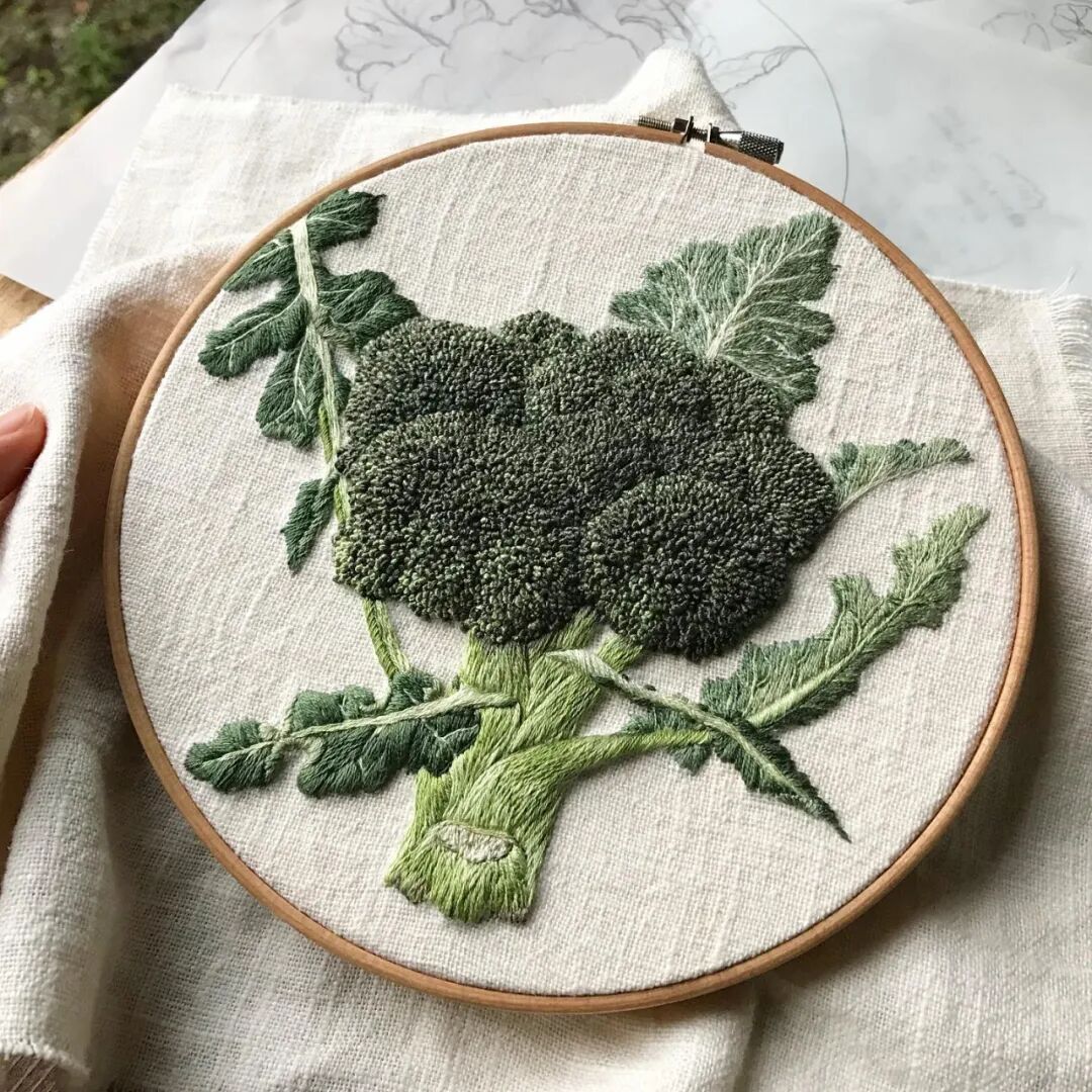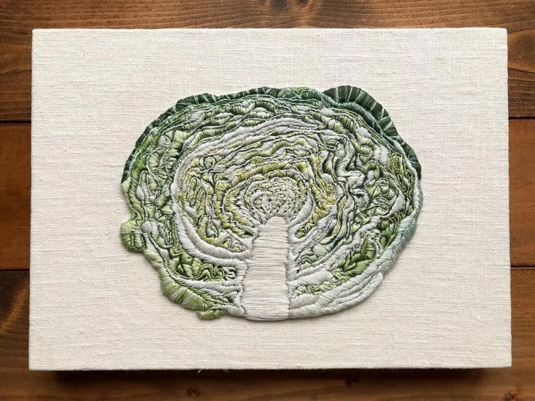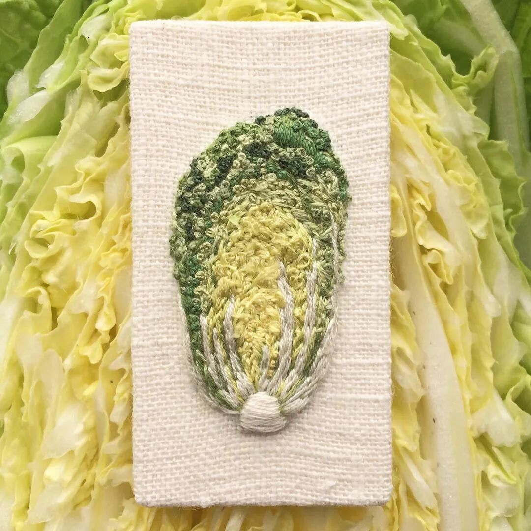 天分加上努力,让这位艺术家很快就形成了自己的刺绣风格,并被人们接受和喜爱。她的蔬菜刺绣作品非常多,但是几乎都是我们很常见的,比如香菇、大葱、白菜、萝卜等等,琳琅满目,她以真实的蔬菜为原型,几乎是一比一还原,我们可以看到卷曲的菜叶,也能看到刚刚出土的菜根,栩栩如生,看起来就像真正的蔬菜一样。