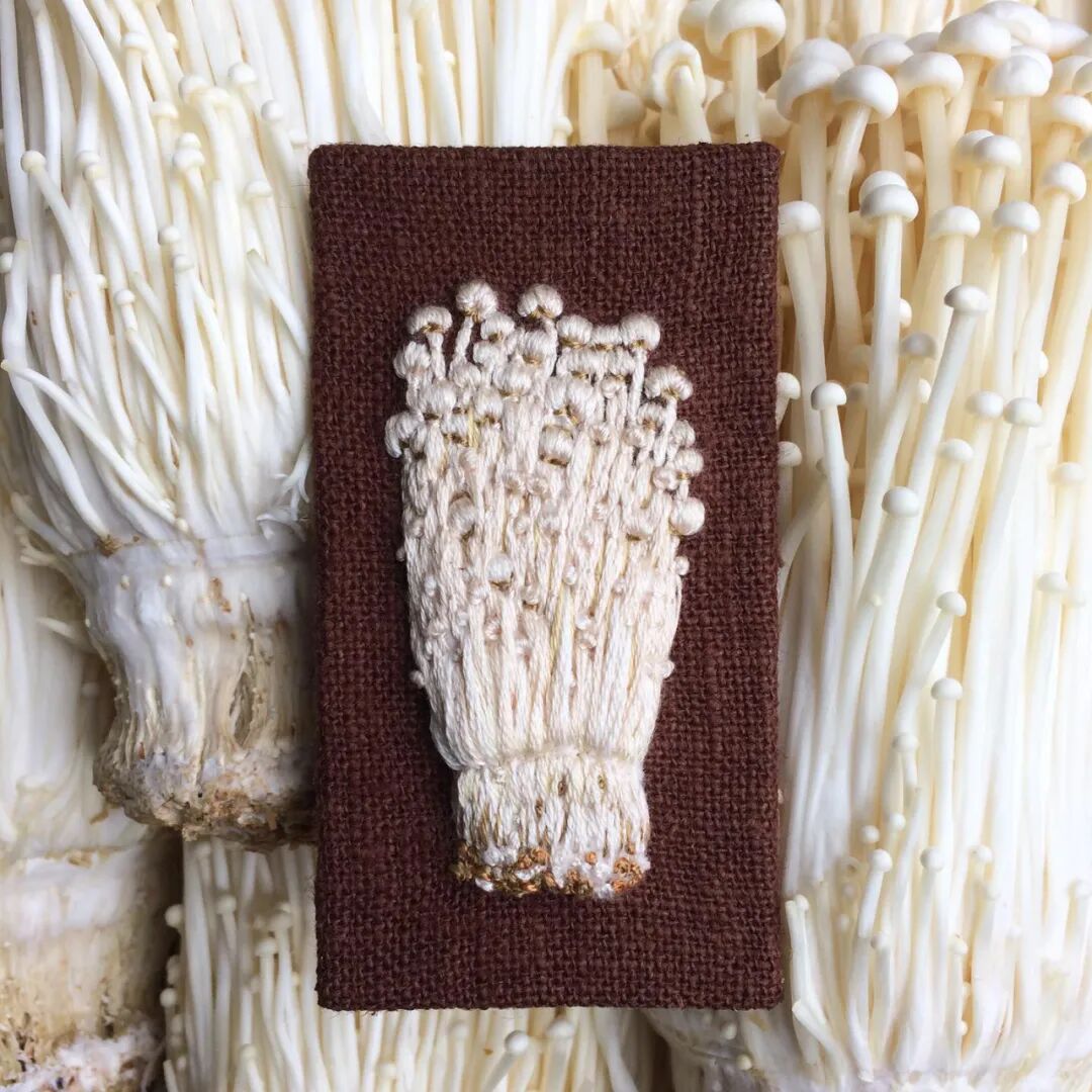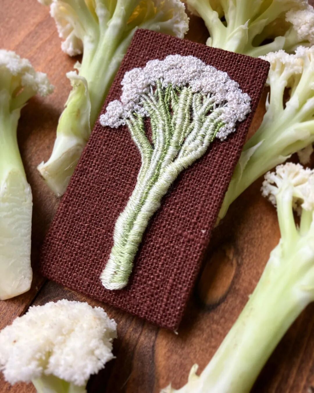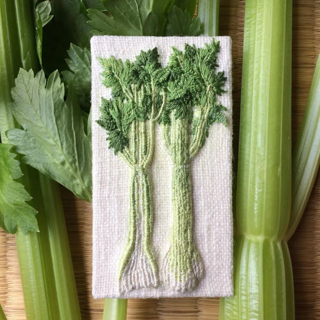 天分加上努力,让这位艺术家很快就形成了自己的刺绣风格,并被人们接受和喜爱。她的蔬菜刺绣作品非常多,但是几乎都是我们很常见的,比如香菇、大葱、白菜、萝卜等等,琳琅满目,她以真实的蔬菜为原型,几乎是一比一还原,我们可以看到卷曲的菜叶,也能看到刚刚出土的菜根,栩栩如生,看起来就像真正的蔬菜一样。