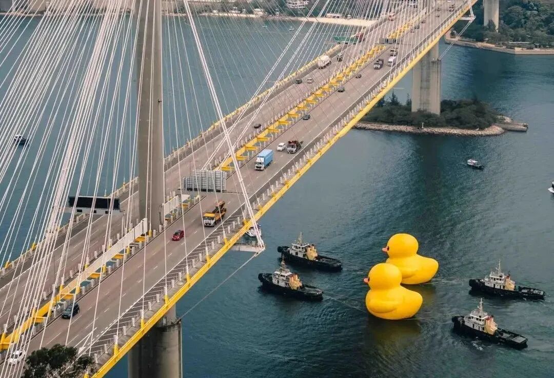 据绛紫艺术了解,早在2007年,艺术家霍夫曼就带着橡皮大黄鸭环游世界了,这只大黄鸭尺寸也在不断增高变大,10年前来到香港的一只大黄鸭尺寸有16.5米高,而在今年来到香港的大黄鸭高达18米,从一只也变成了两只,寓意好事成双鸭。