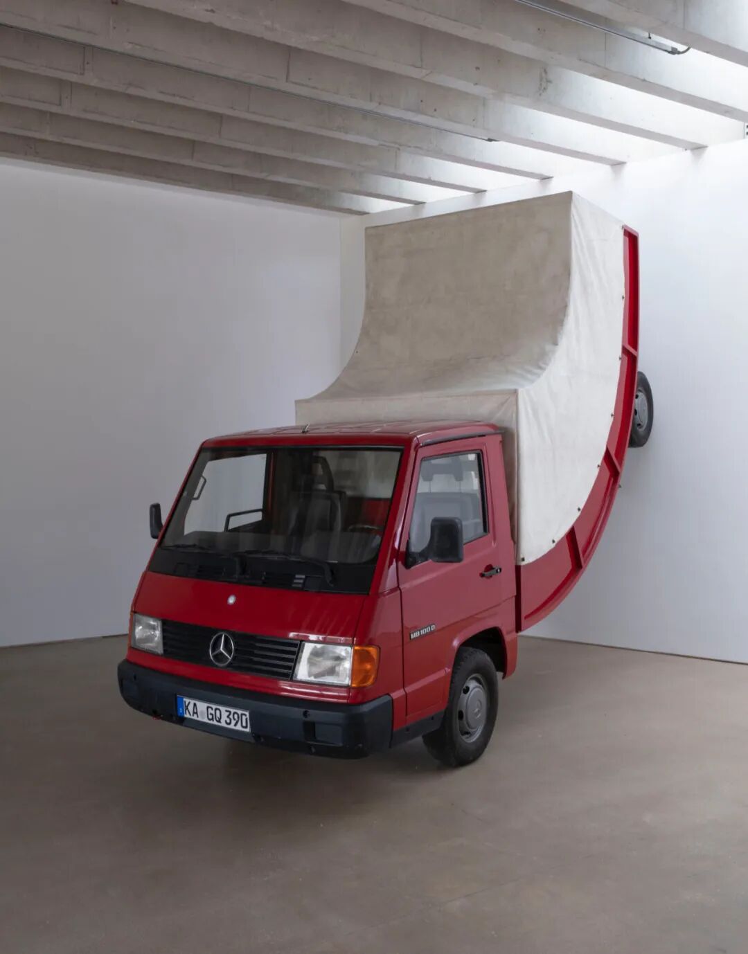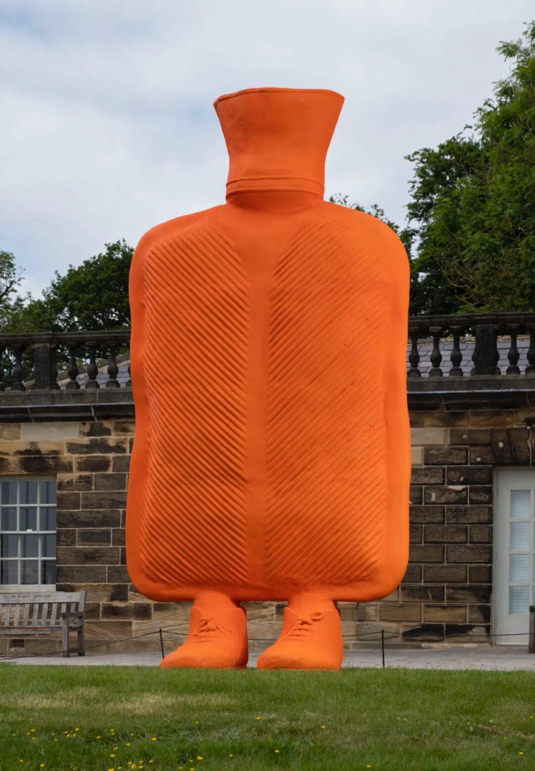 一个橘红色巨大的塑料热水袋,穿着鞋子一本正经地出现在人们面前。两根长长的香肠,像人类一样拥抱亲吻在一起。一辆运货的汽车,车厢弯曲成了“c”形,后轮都翘到了墙壁上。这些古怪的雕塑作品,都出自当代雕塑家欧文·沃姆之手。