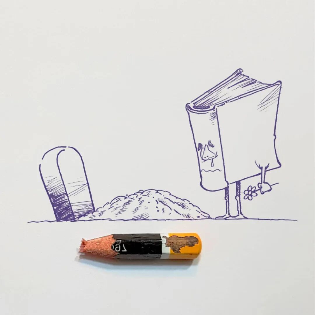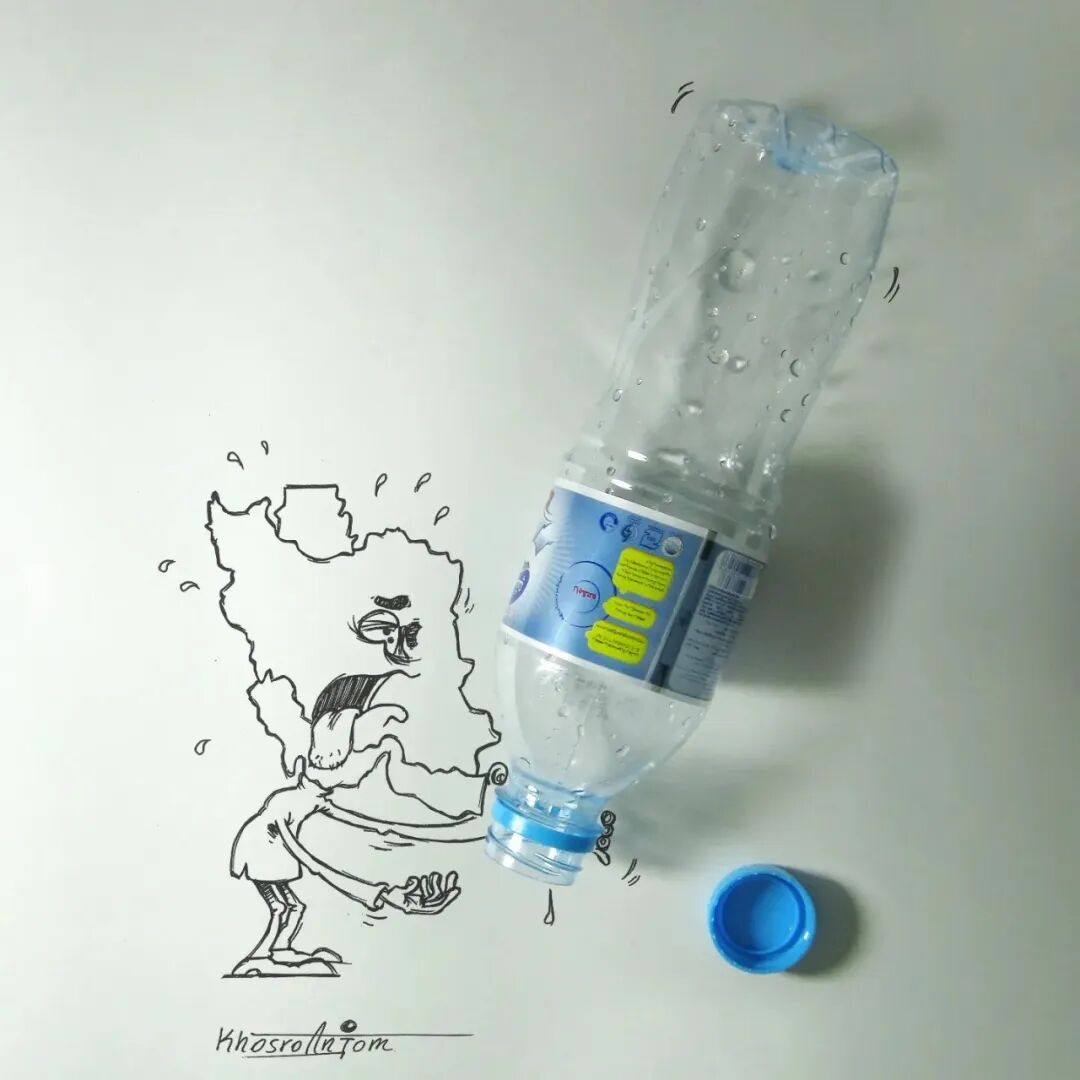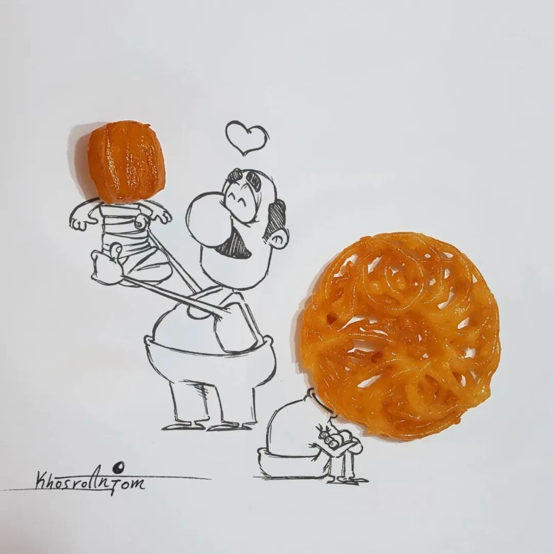 马吉德·霍斯罗安乔姆的涂鸦,大多是用墨水或者铅笔素描出来的,在二维的纸面上,被这位艺术家放置上一些三维的物品,比如生活用品、食物等,似乎,两个不同维度的世界无缝地结合在一起,带给人非常特别的视觉效果。