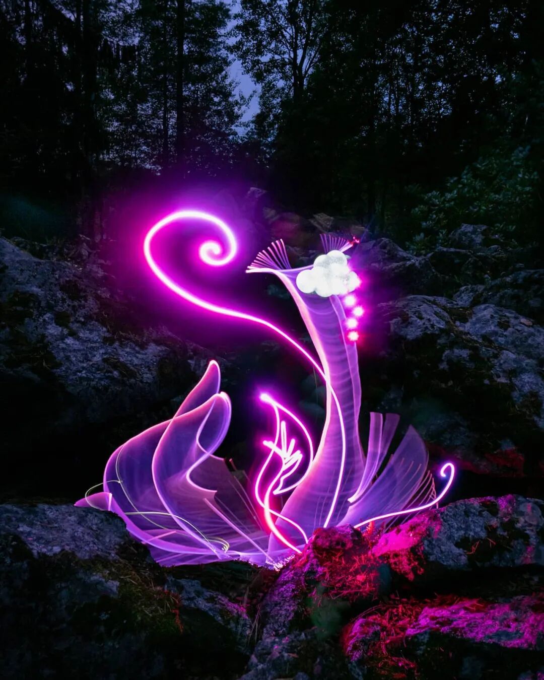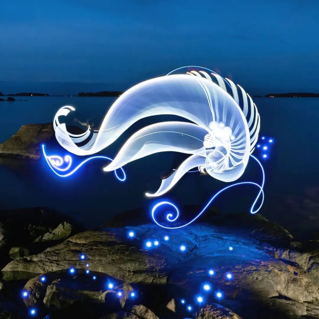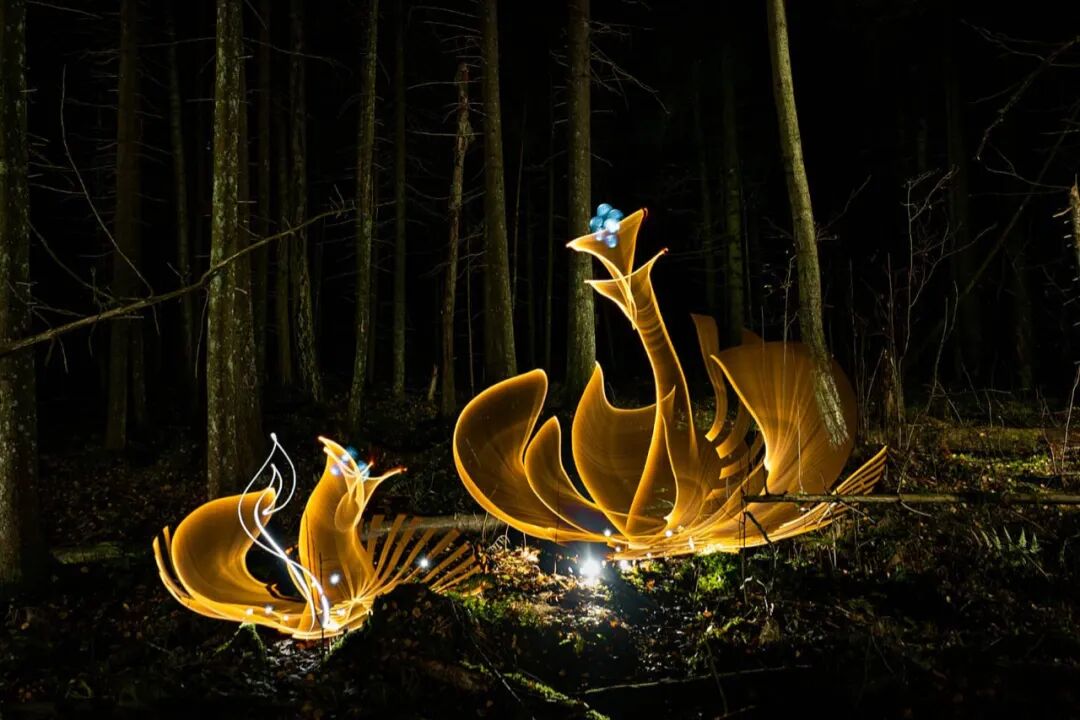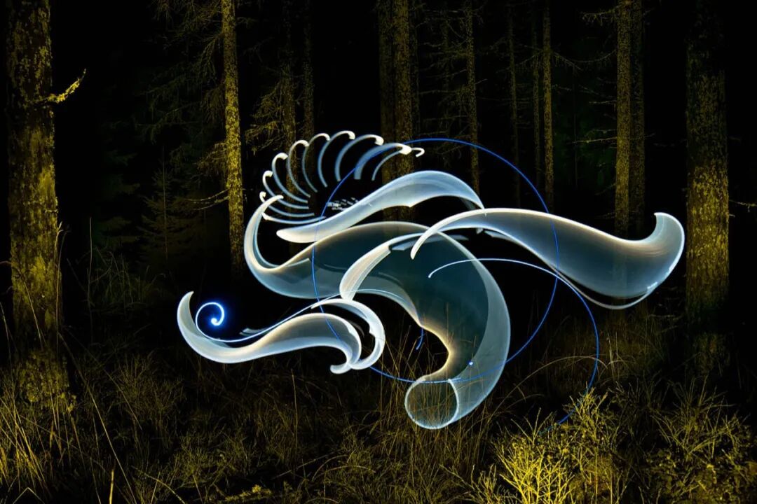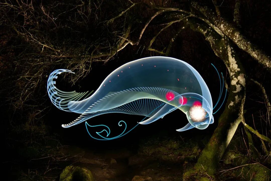 相信很多人在看完这些光绘作品后,都会被这些作品所吸引,想要了解这些光绘作品是由那种工具绘制而成,据汉努·胡塔莫介绍,他通常会使用多种尺寸的透明光纤,然后将其连接到手电筒上,至于颜色问题,则是使用彩色滤光片,为透明光纤带来颜色,彩色滤光片的加入,给这些光绘作品带来了很多可能性,让这些光绘作品变得更加丰富多彩。