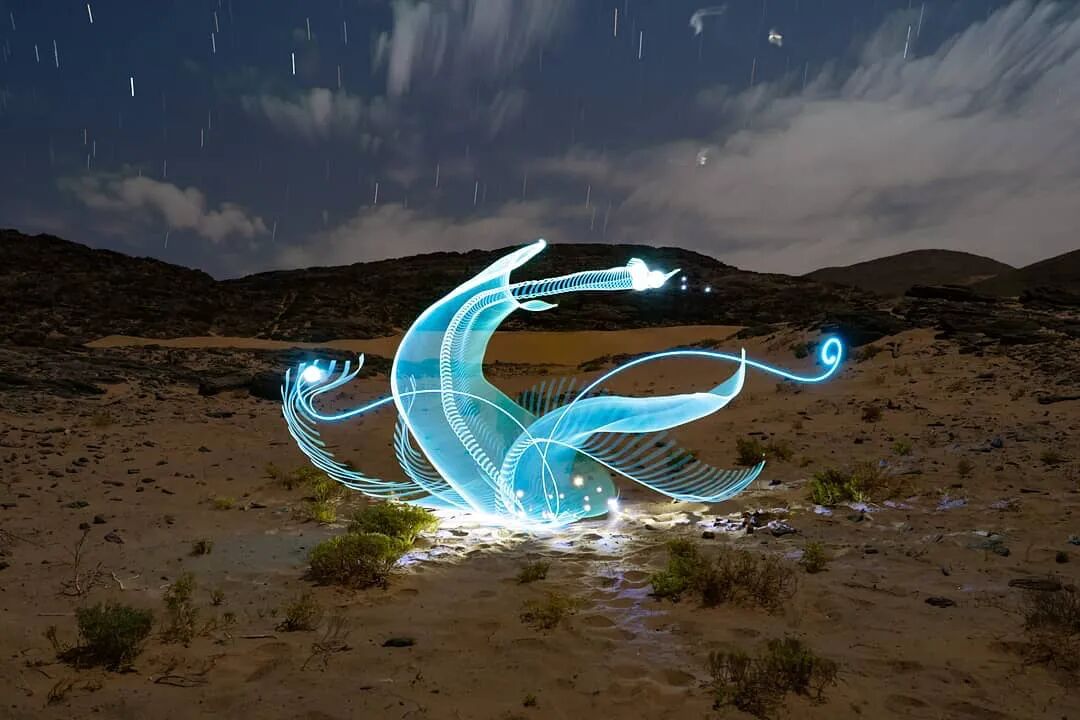为了更容易完成用风光绘制工作,这位摄影师会将草图分成几个部分去进行反复尝试。除了大量的前期准备工作外,光绘作品的难点在于去哪里寻找合适的场景,将光绘作品融入其中。