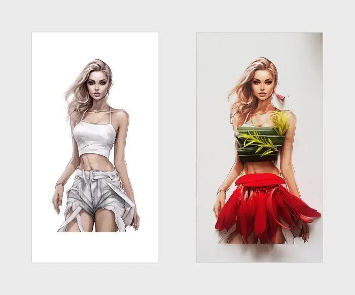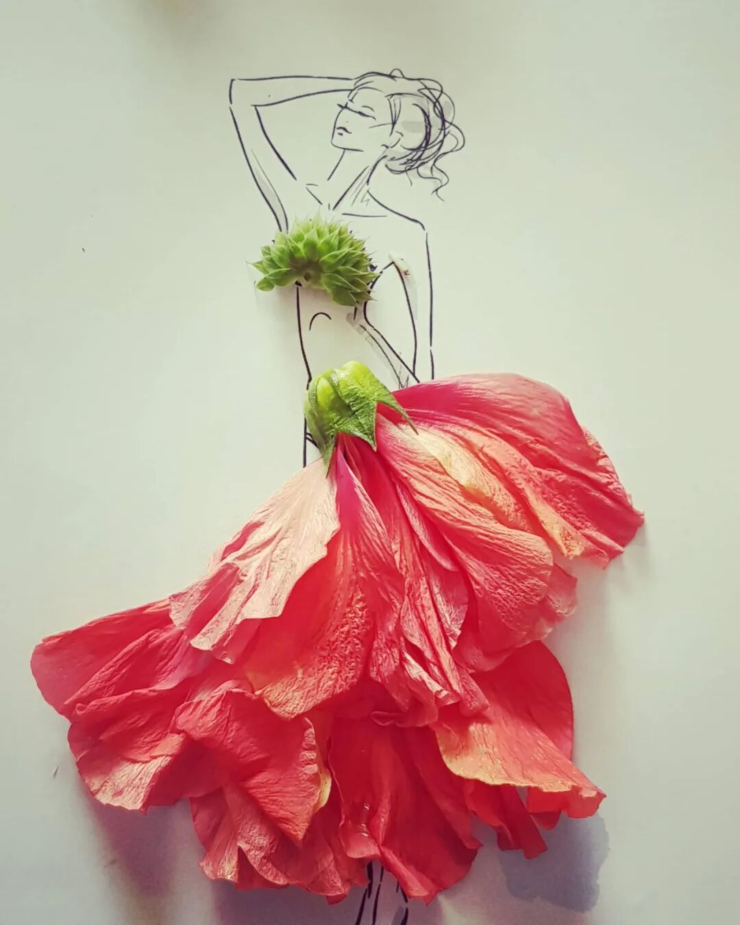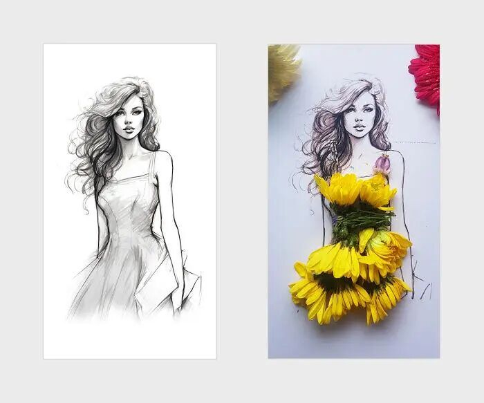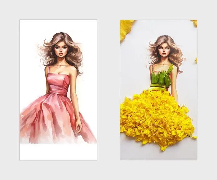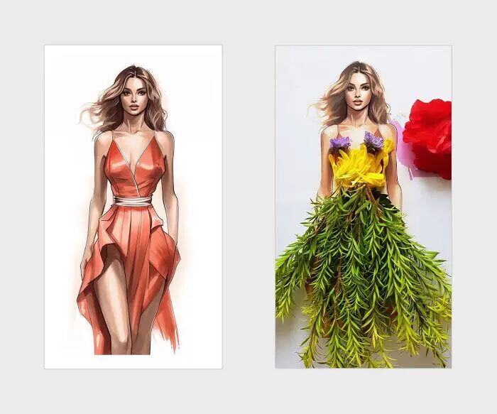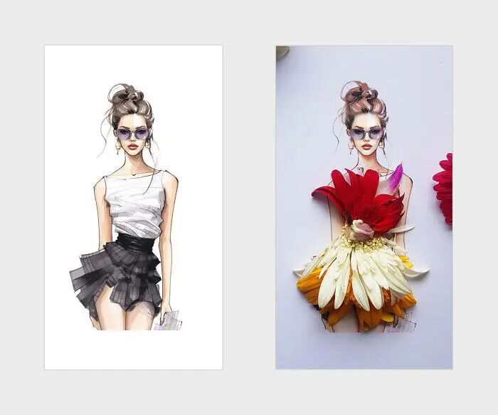 接下来,通过以下的对比图片,让我们一起来欣赏一下充满自然之美和创意之美的鲜花服饰吧。