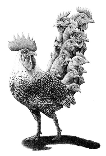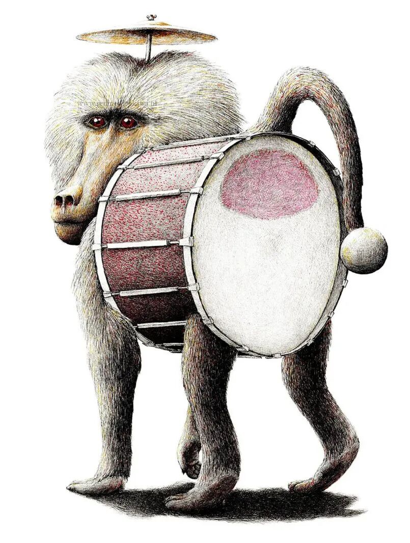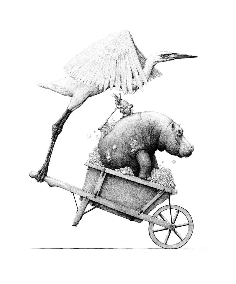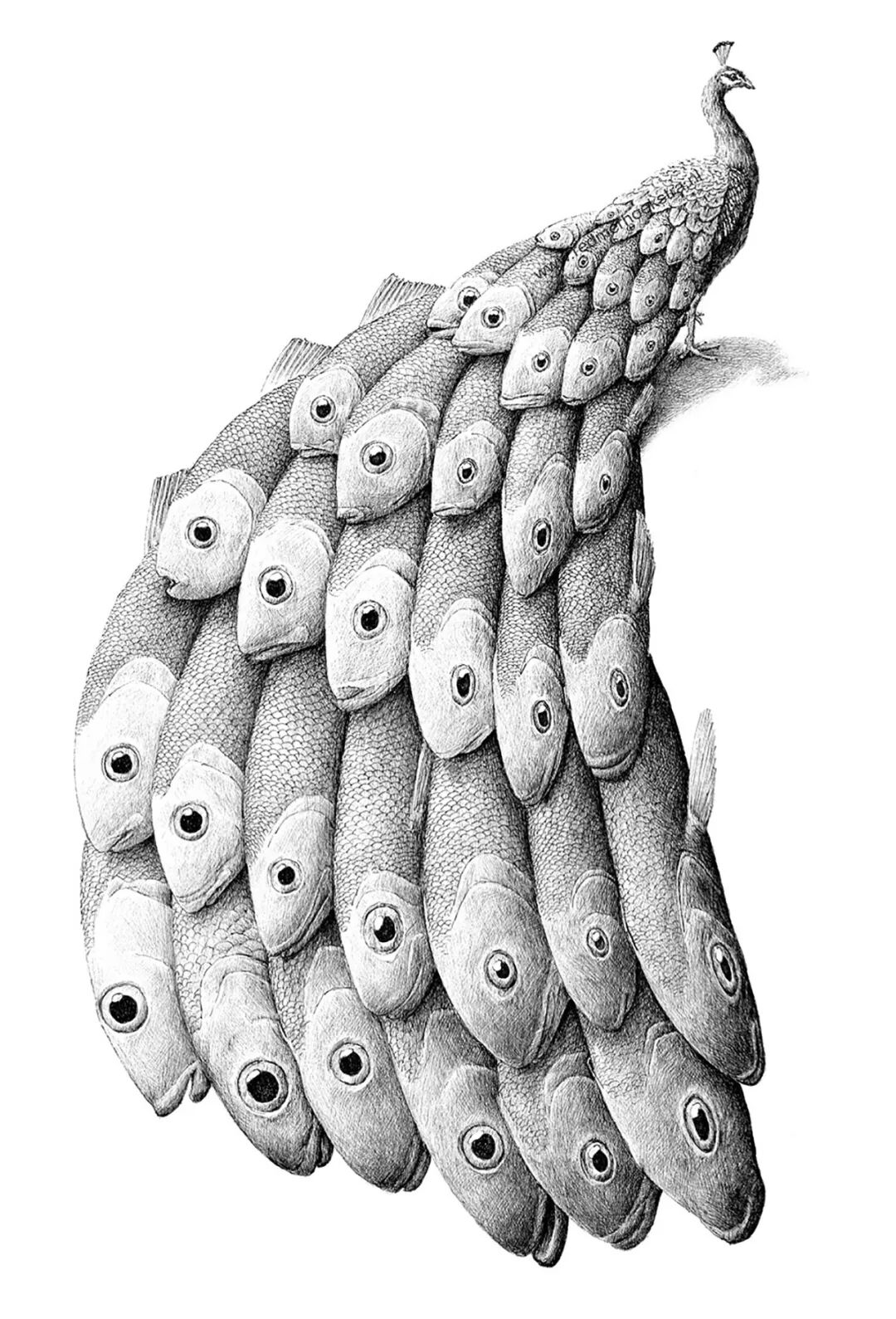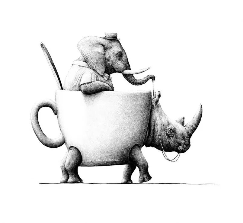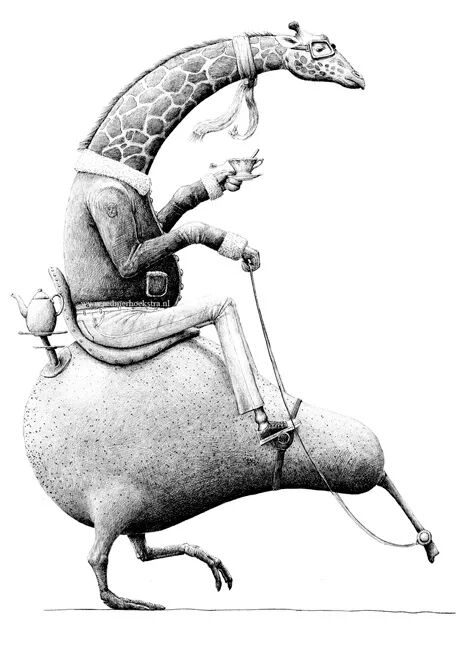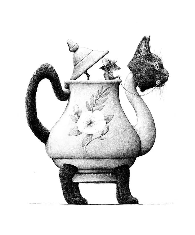 在雷德默·胡克斯特拉的超现实作品中,我们可以看到许多动物形象,这些超现实动物与我们常见的动物形象有很大区别,例如:猎豹的身体变成了小提琴,家猫变成了一个茶壶,孔雀漂亮的羽毛变成一条条鱼儿......看似没有联系的动物和日常用品随机融合到了一起,给人一种十分俏皮的感觉。同时,这些超现实作品也让我们打破以往的思维习惯,以新的方式去观察这个世界。