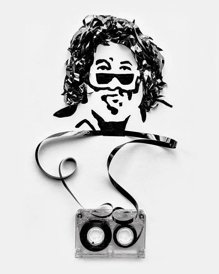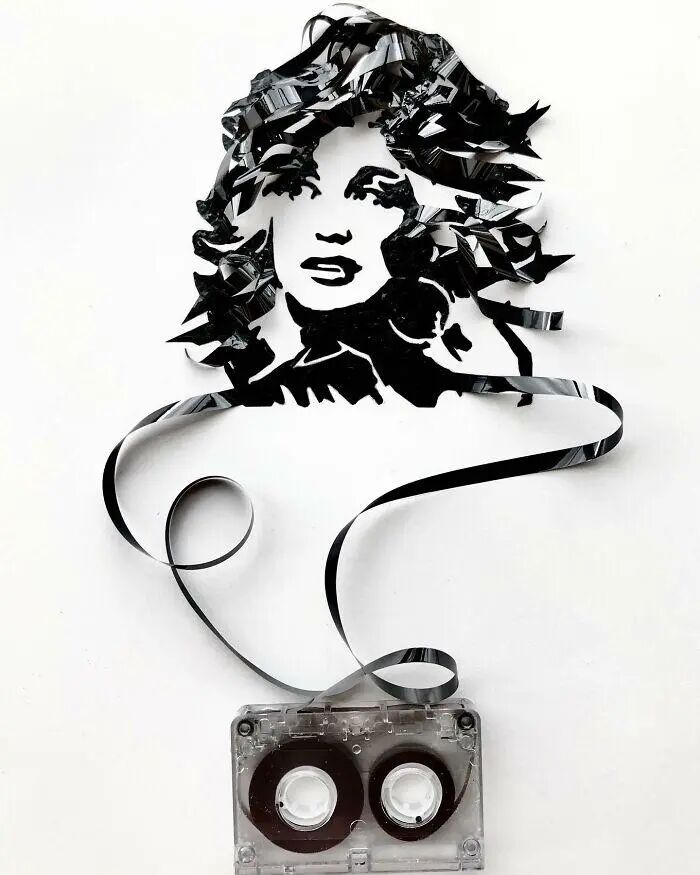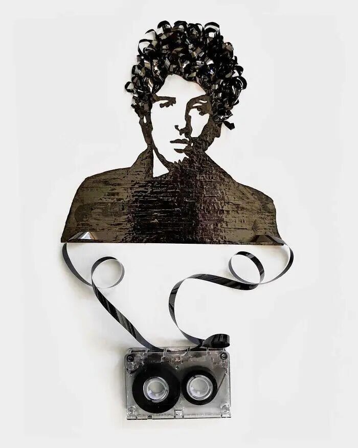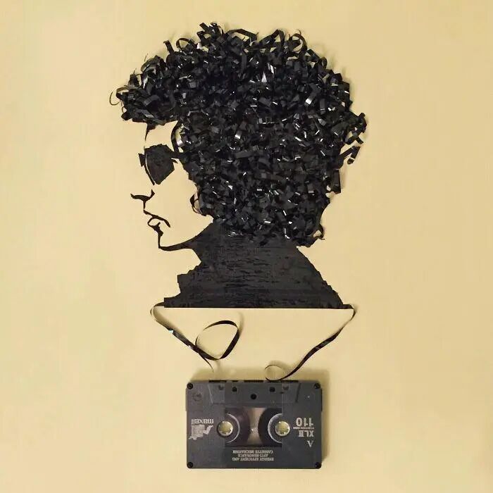 整整两天的时间里,艾米·卡森用盒式磁带和胶水,为鲍勃·迪伦“画”了一幅肖像。她首先会在纸上勾勒出大致的轮廓,然后切割每条胶带,使它们能够完全适合它需要去的地方,然后用胶水粘贴固定。大致轮廓贴完后,再添加更多的磁带来丰富细节,最终呈现出类似3D的效果。