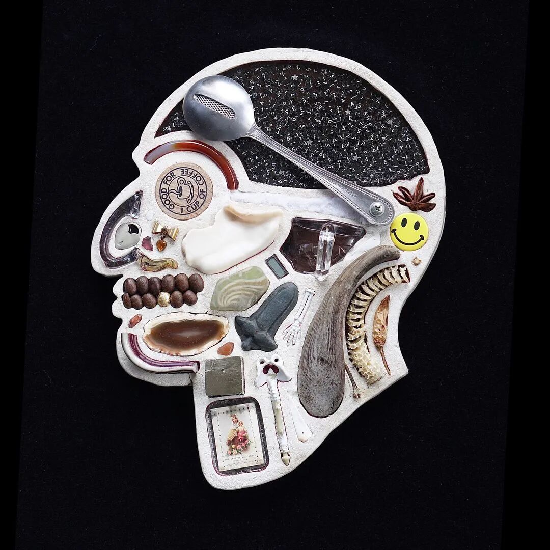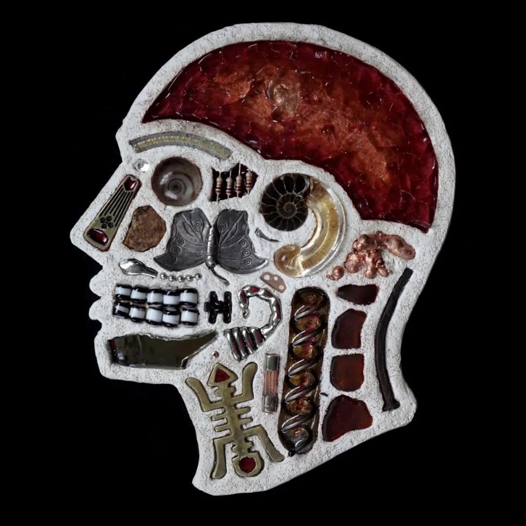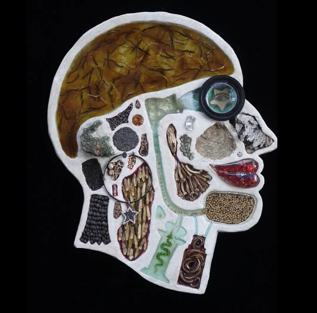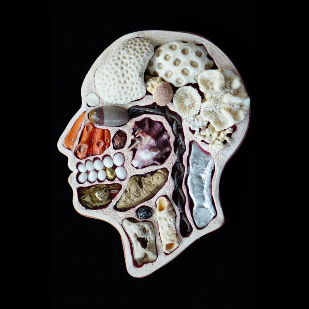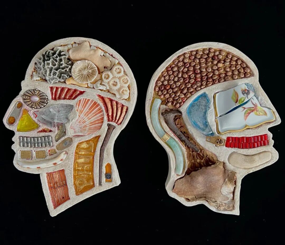 这两位艺术家从事这个系列作品制作已经有10年的时间了,他们用石膏去模仿人类的头骨造型,然后再将这个头骨分割成几个不同区域,最后再使用各类材料去填充这个石膏头骨,最终形成我们看到的《头脑》系列作品。